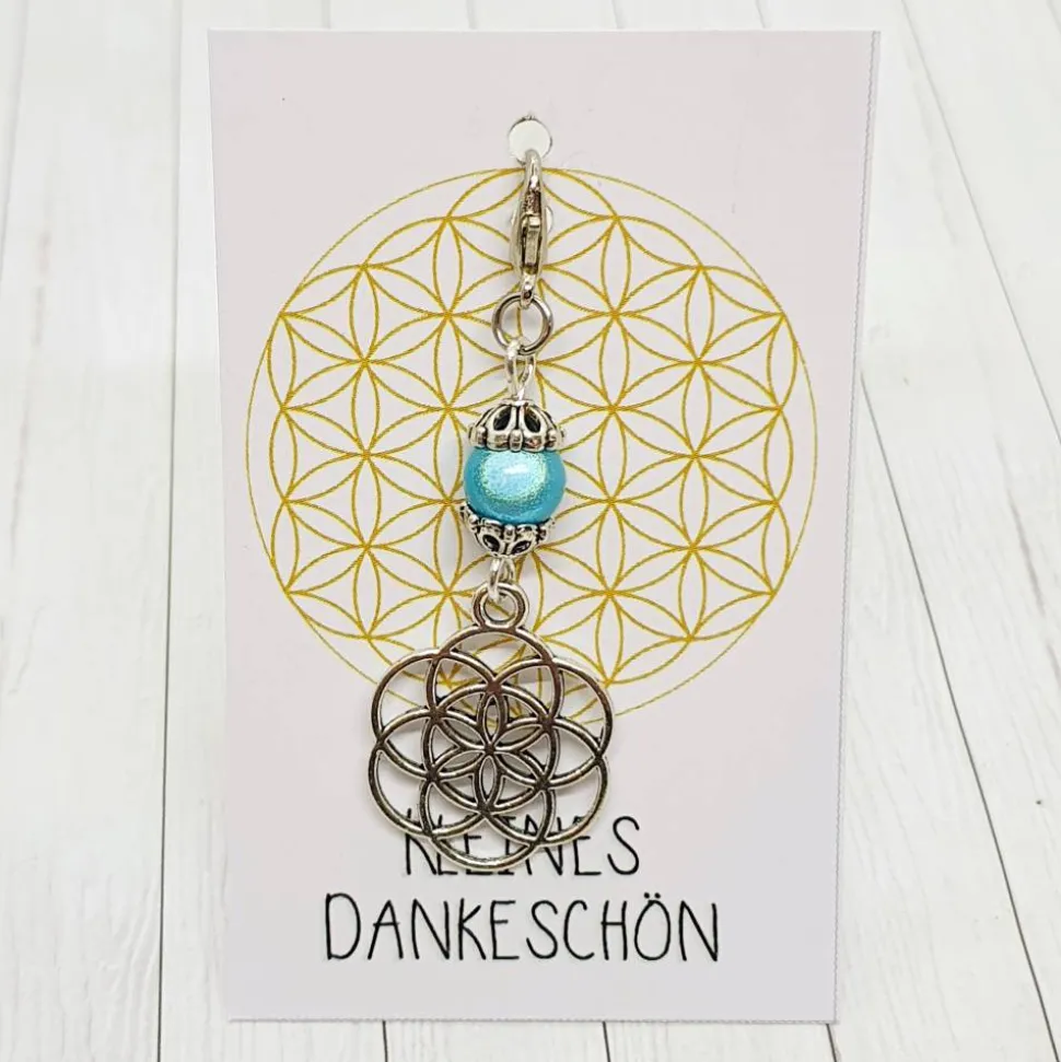 Entdecke den einzigartigen Glücksbringer Anhänger in Form des Samen des Lebens – silberfarben und kombiniert mit einer hellblauen 3D-Acrylperle. Mit praktischem Karabiner ist er vielseitig einsetzbar und lässt sich einfach an Taschen, Schlüssel oder Schmuck befestigen.