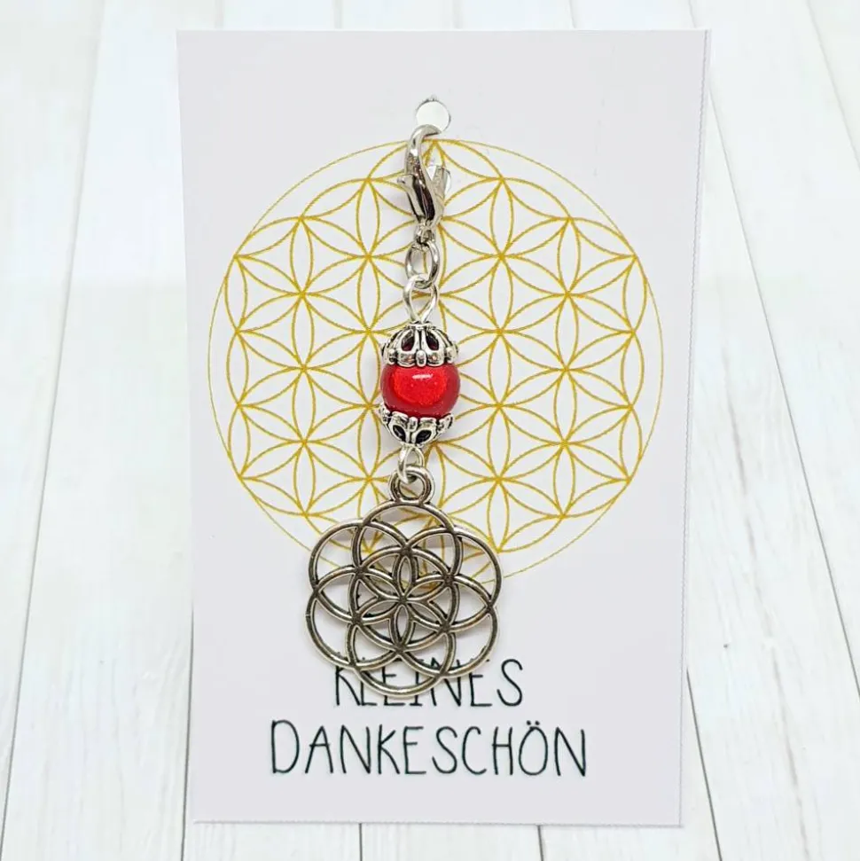 Entdecke den Glücksbringer Same des Lebens silberfarben/rot: Ein wunderschöner, 2cm breiter Anhänger in Form des Samen des Lebens, kombiniert mit einer leuchtenden roten 3D-Acrylperle. Der praktische Karabiner sorgt für einfaches Befestigen an Tasche, Schlüsselbund oder Schmuck.