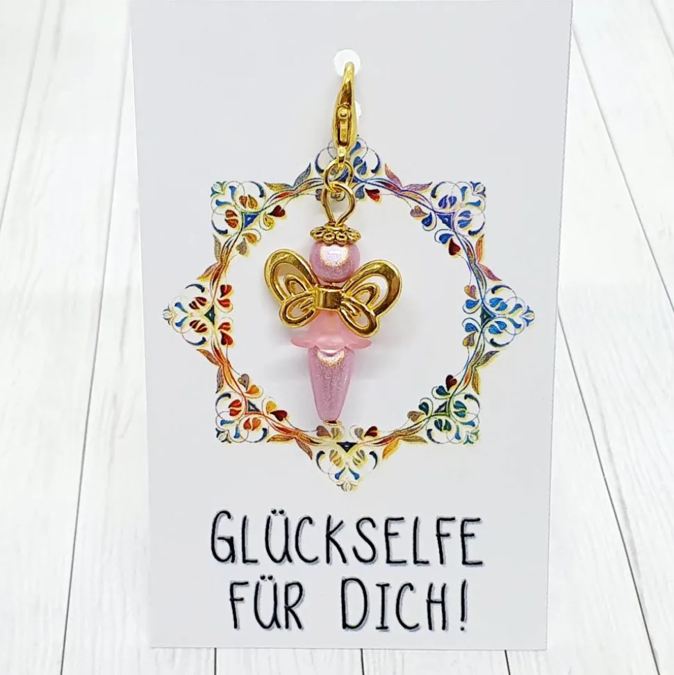 Entdecke die zauberhafte Glücksbringer Schmetterlingselfe goldfarben / rosa – ein zartes, handgefertigtes Wesen, das Dir ganz viel Glück bringt! Diese filigrane Schmetterlingselfe findest Du normalerweise in verwunschenen Wäldern, doch nun kannst Du sie als besonderen Glücksbringer immer bei Dir tragen.