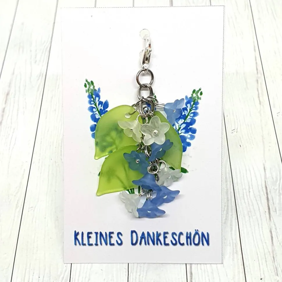 Sag es mit Blumen! Der Glücksbringer Taschenbaumler „Zarte Blumen“ in Blau ist ein bezaubernder Anhänger, der garantiert jede Tasche oder jeden Rucksack aufpeppt. Die zierlichen Blümchen aus hochwertigem Acryl brauchen kein Wasser und verblühen nie – praktisch und langlebig!