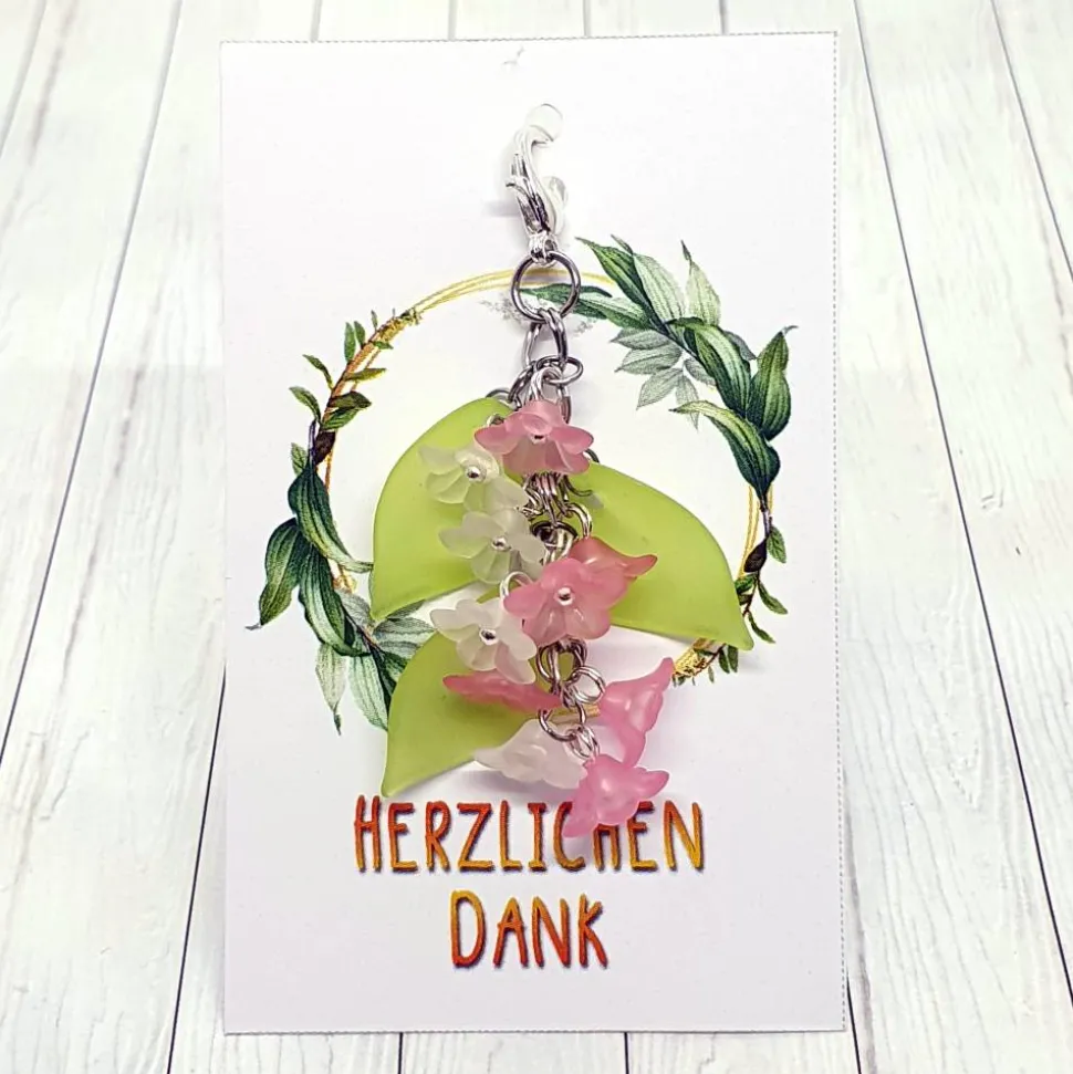 Du erhältst einen verspielten Anhänger mit insgesamt 10 Acrylblüten in zwei verschiedenen Farben sowie drei passenden grünen Blättchen. Alles ist an einem feinen Kettchen mit Karabiner befestigt und peppt garantiert jedes Accessoire auf.