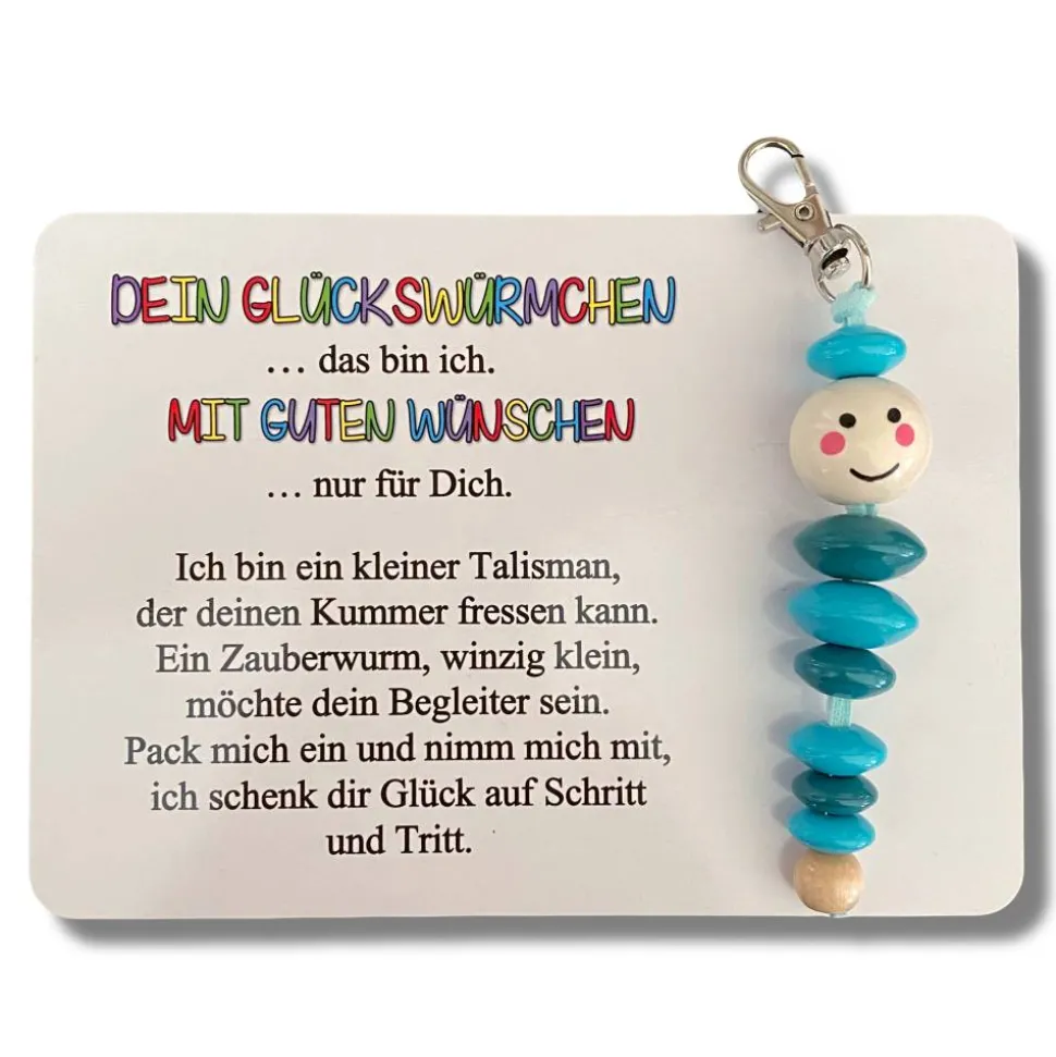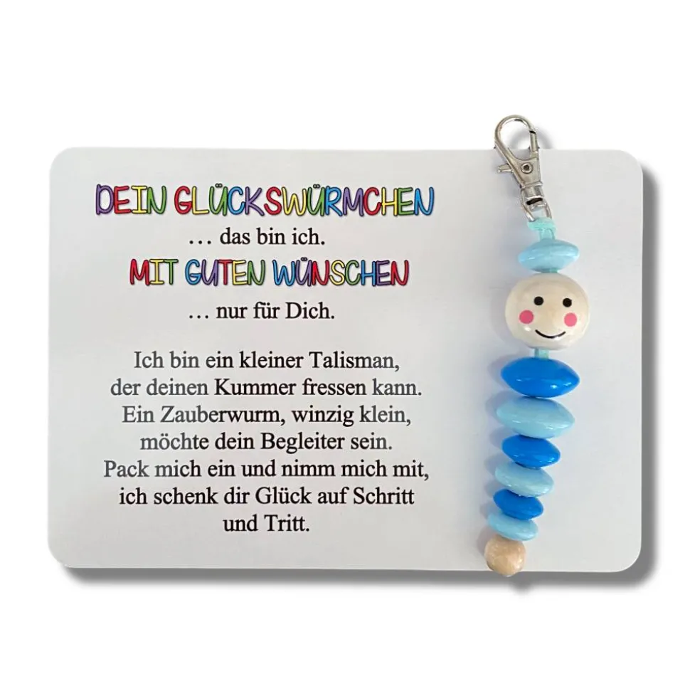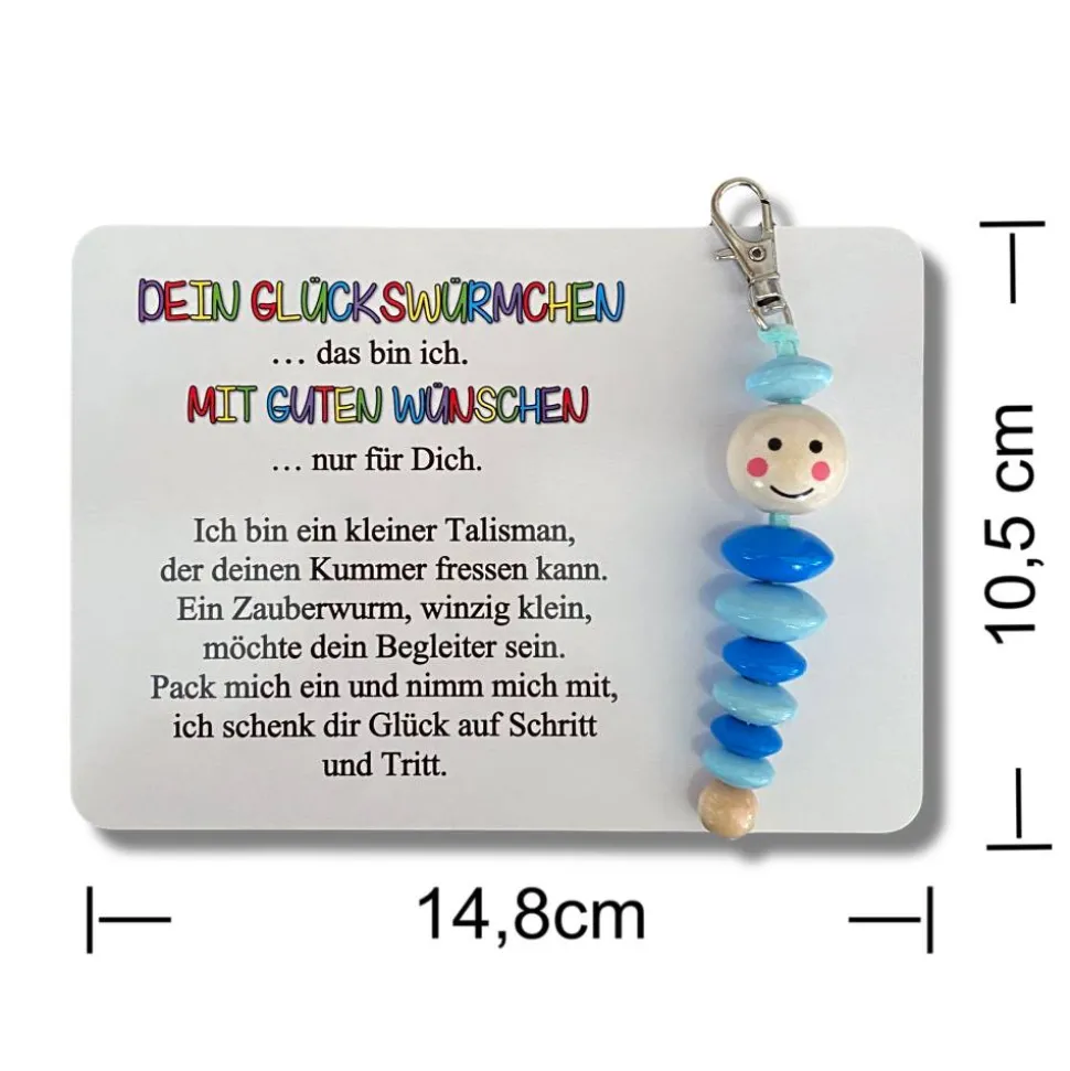 Liebevoll gestaltetes Glückswürmchen, aus Holzperlen in Linsenform und mit einem süßen Holzkopf versehen. Die bei den Perlen und Motiven verwendeten Farben, Lacke und Beize entsprechen den rechtlichen Bedingungen der DIN EN71-3. Dadurch sind die Produkte schadstofffrei, schweiß- und speichelfest*. Das Würmchen soll dir Freude und Glück spenden – es soll dir helfen, wenn du Angst hast und dir in der Not beistehen. Ein kleines, niedliches Tierchen, welches du überall mit hinnehmen oder in/ an die Tasche hängen kannst. Es ist mit Karabiner ca. 12 cm lang und für dich ein treuer Begleiter auf all deinen Wegen. Man kann sie aber auch wunderbar verschenken. Das Würmchen kommt mit einer Postkarte A6 in premium Hochglanz Qualität mit Spruch, verpackt in einem Organzasäckchen zu dir. KEIN SPIELZEUG – nicht für Kinder unter 3 Jahren geeignet.