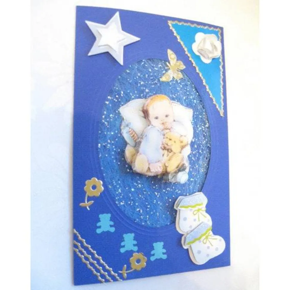 Verziert sind diese Glückwünsche, Grußkarte zur Geburt / Taufe eines Baby mit verschiedenen Dekomaterialien.