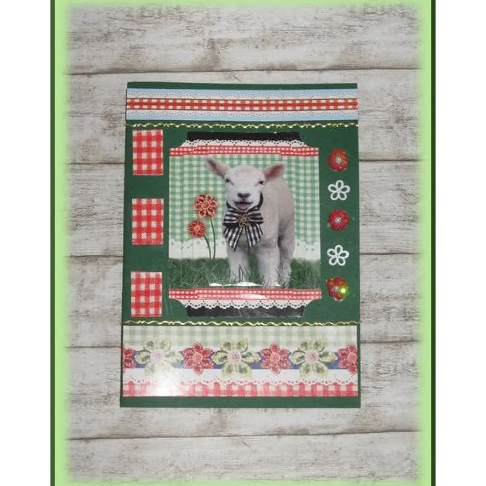 Die Glückwunschkarte mit dem Schaf in 3d wurde mit verschiedenst bedruckten Kartenkartons verziert. Des weiteren wurde das Lämmchen mit Streudeko und Stickern umrahmt