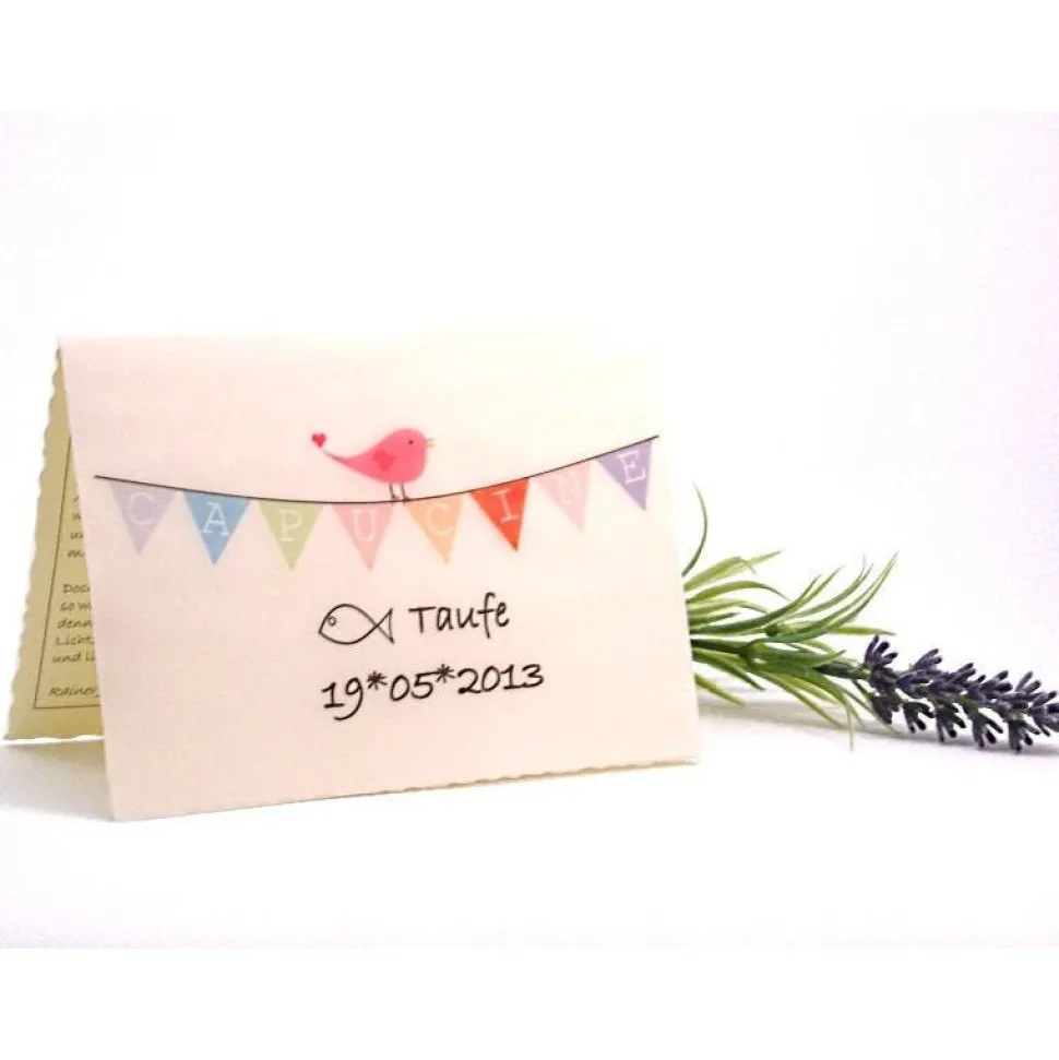 Die Karte ist individuell auf sehr festes Transparentpapier gedruckt und mit einer cremeweißen Büttenkarton Faltkarte verstärkt.