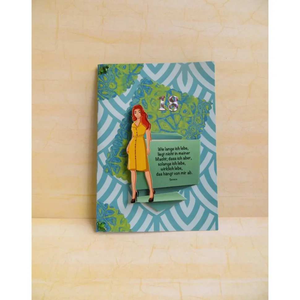 Die Geburtstagskarte selbst ist aus bedruckte Kartenkarton, mit der Zahl 18 dekoriert, verziert mit einem großen Bild mit Spruch.