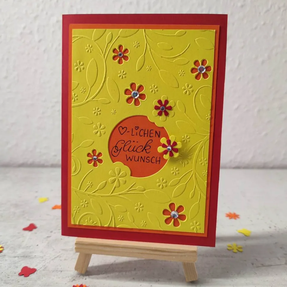 Die Karte besteht aus verschiedenen Papieren. Das oberste hab ich geprägt und mit ausgestanzten Blumen versehen. Die Blumen schmücken Strasssteine. Der Schriftzug ist handgeschrieben.
