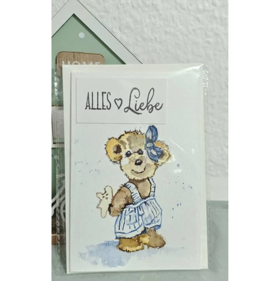 Alles Liebe kann man zu jeder Gelegenheit wünschen. Geburtstag, Taufe oder auch Einschulung, da in der Klappkarte keine weiteren Texte vermerkt wurden passt sie zu allen Anlässen. Der kleine braune Teddy hält ein kleines Präsent hinter dem Rücken versteckt und schaut den neuen Besitzer mit freundlichen und lieben Blick an. Der Teddy freut sich schon auf seinen neuen Besitzer.