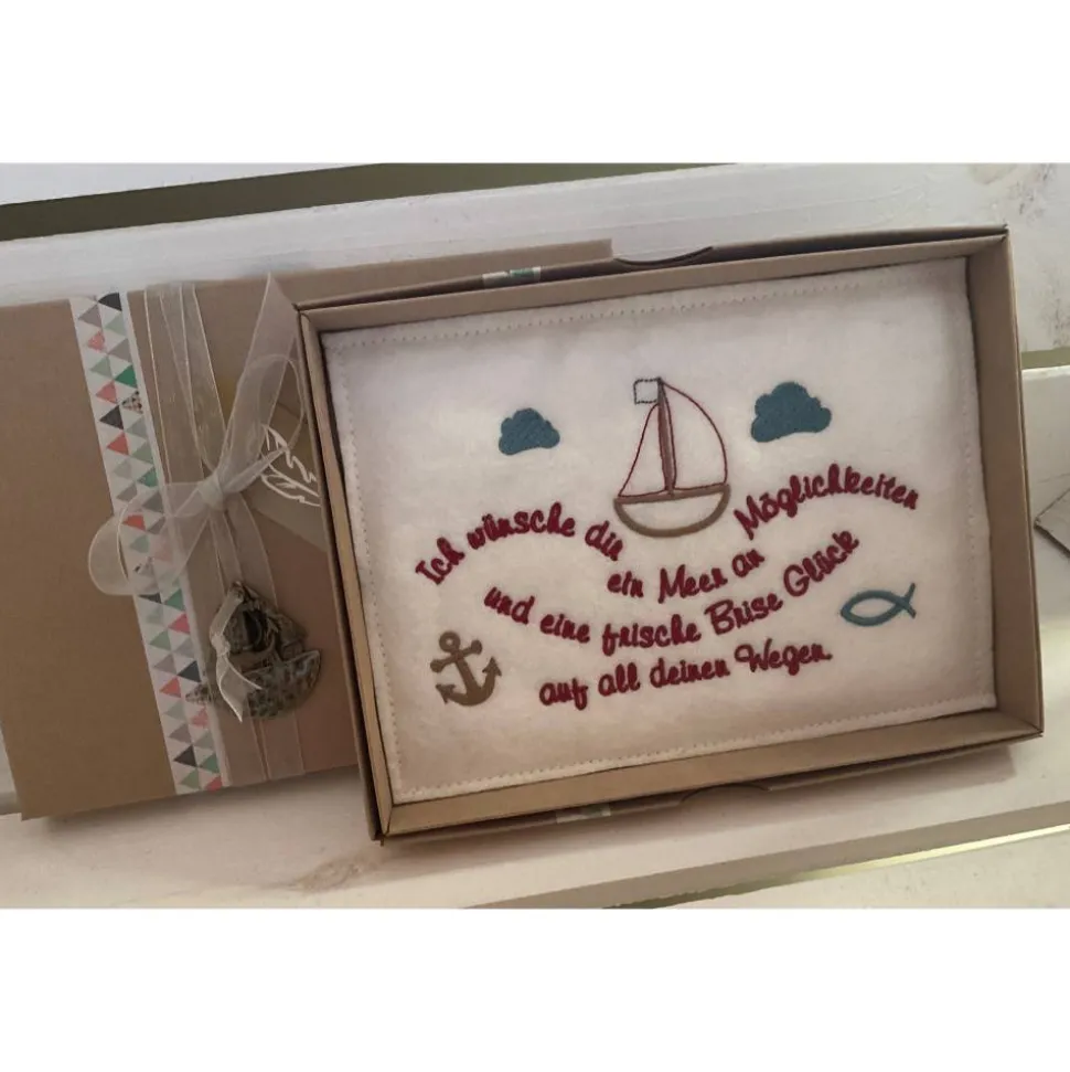 Verzierung des Kartondeckels mit Schlaufe und Metallanhänger Segelboot/Anker