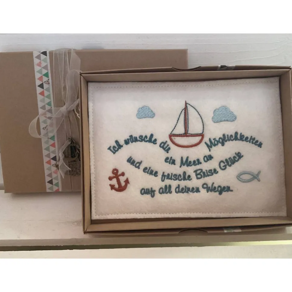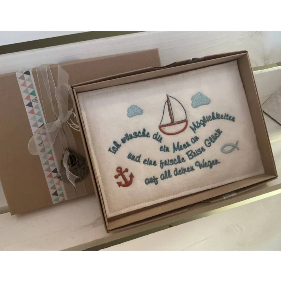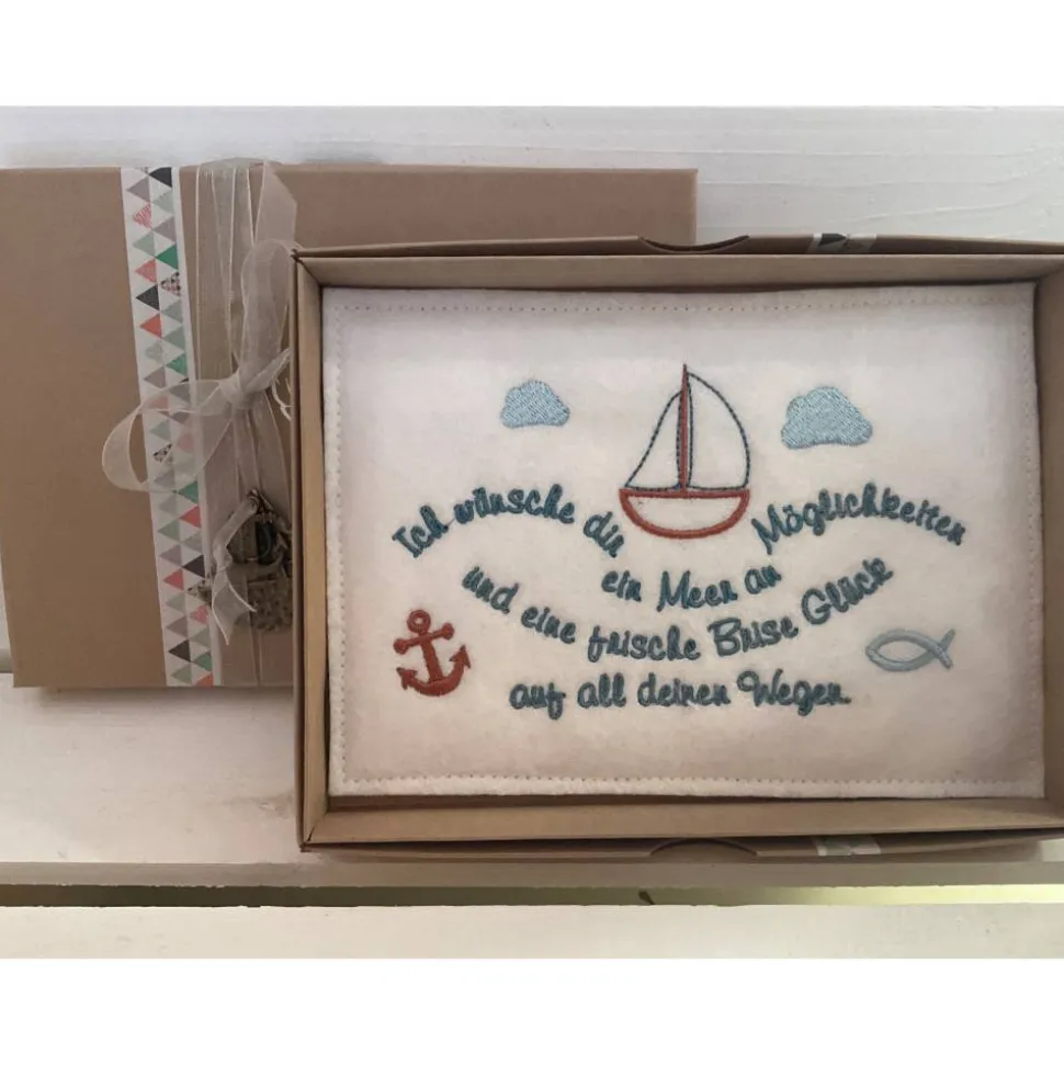 Verzierung des Kartondeckels mit Schlaufe und Metallanhänger Segelboot/Anker
