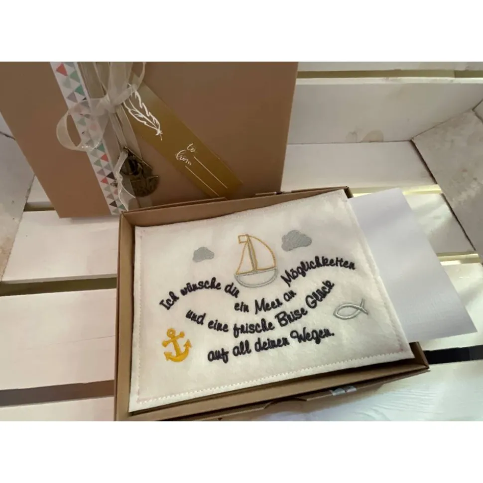 Im Inneren eine bestickte Filzkarte mit seitlichem Einschub für Geld oder eine Botschaft, oder Beides!