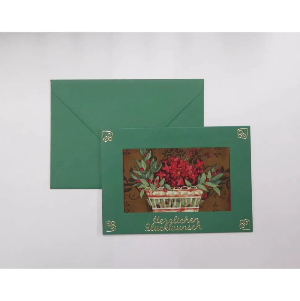 Die Karte ist mit einem goldfarbenen Schriftzug Herzlichen Glückwunsch und Herzen dekoriert.