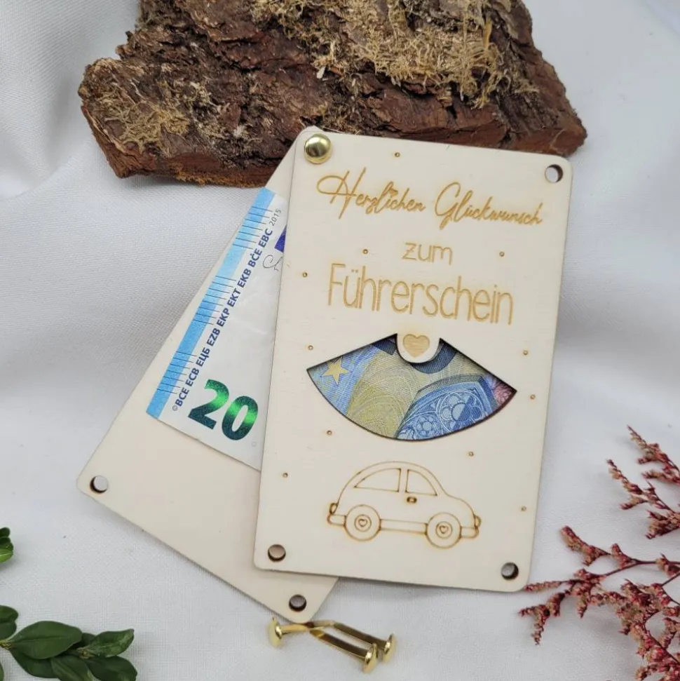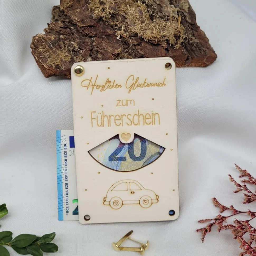 Verschenken Sie Geld auf eine edle und originelle Weise mit unserer Holz-Geschenkkarte in verschiedenen Motiven.