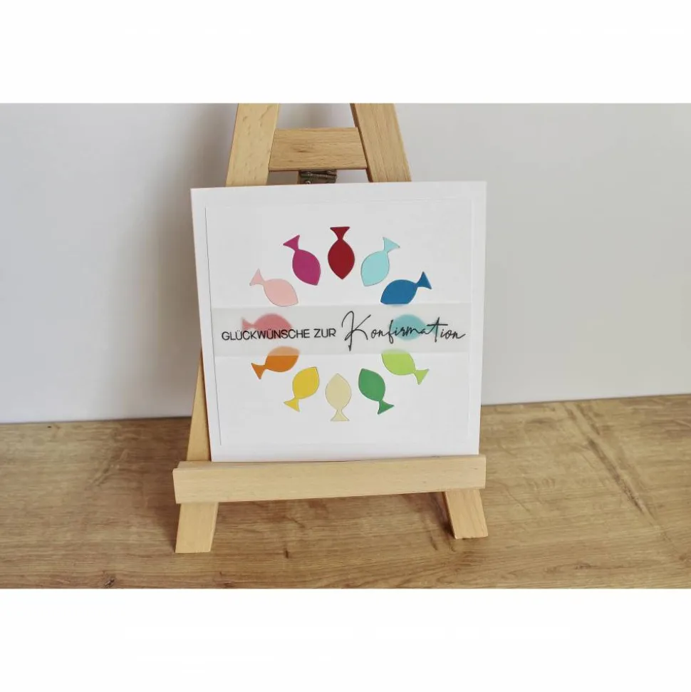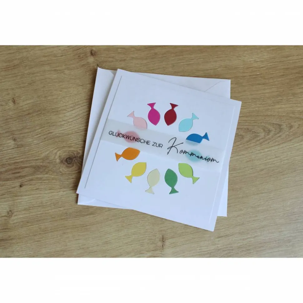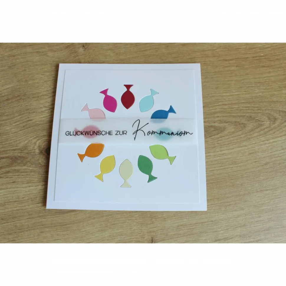Die Glückwunschkarte „Regenbogenfische“ vereint zwei christliche Symbole: der Regenbogen als Zeichen für den Bund zwischen Gott und den Menschen und die Fische als Zeichen der Urchristen.