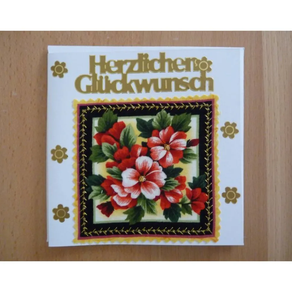 Ausgefallene Karte für einen lieben Menschen mit Stoffbild,dekoriert mit passenden Stickern. Das Stoffbild ist aufgeklebt und aufgenäht.Diese Naht ist innen sichtbar, wie auf dem zweiten Foto dargestellt. MitUmschlag.