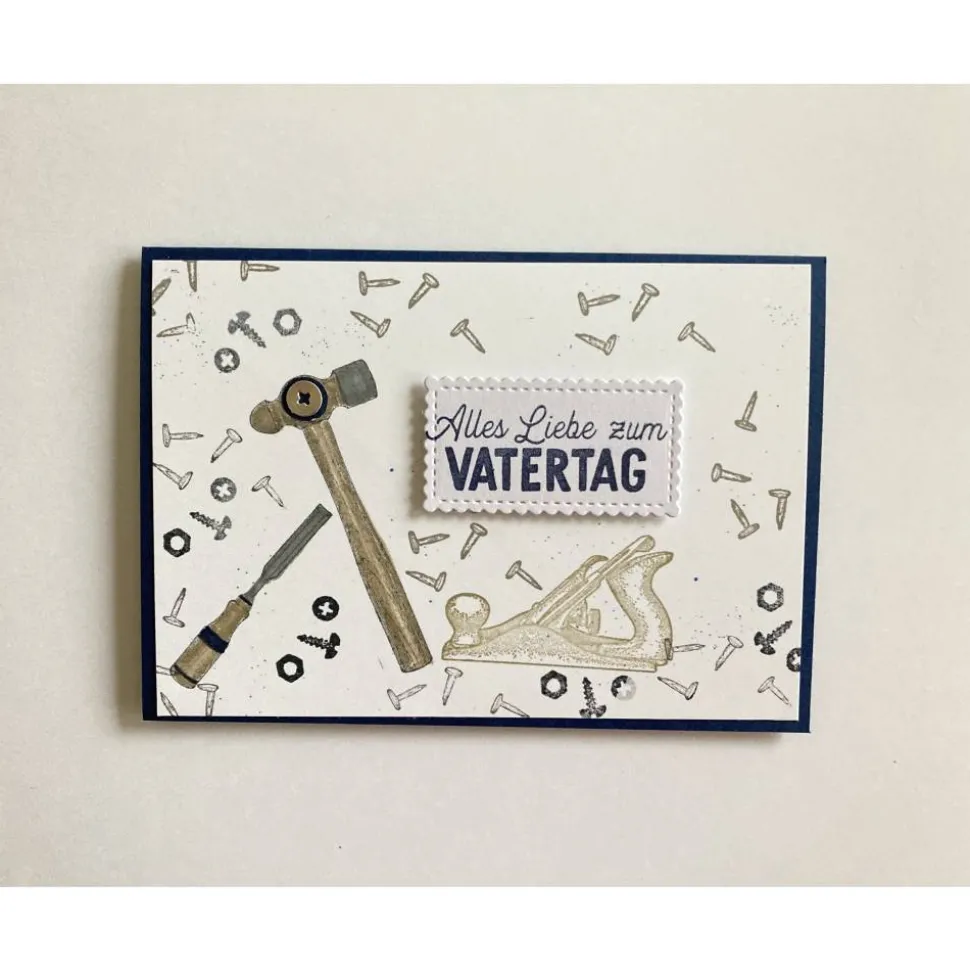 Die Karte ist gestaltet aus grauem, Dunkelblauen und weißem Farbkarton. Verziert mit gestempelten Schrauben & Nägeln und ausgeschnittenem Werkzeug aus Designpapier.
