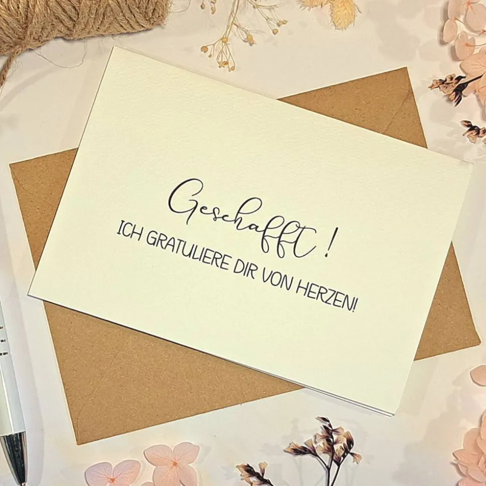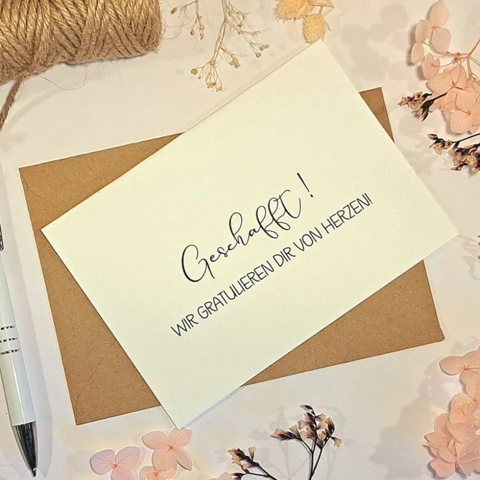Auf der Geschenkkarte steht kunstvoll entweder „Geschafft! Wir gratulieren Dir von Herzen!“ oder „Ich gratuliere Dir von Herzen!“. Der passende Umschlag aus Kraftpapier macht das Geschenk komplett und sorgt für eine hochwertige Präsentation.