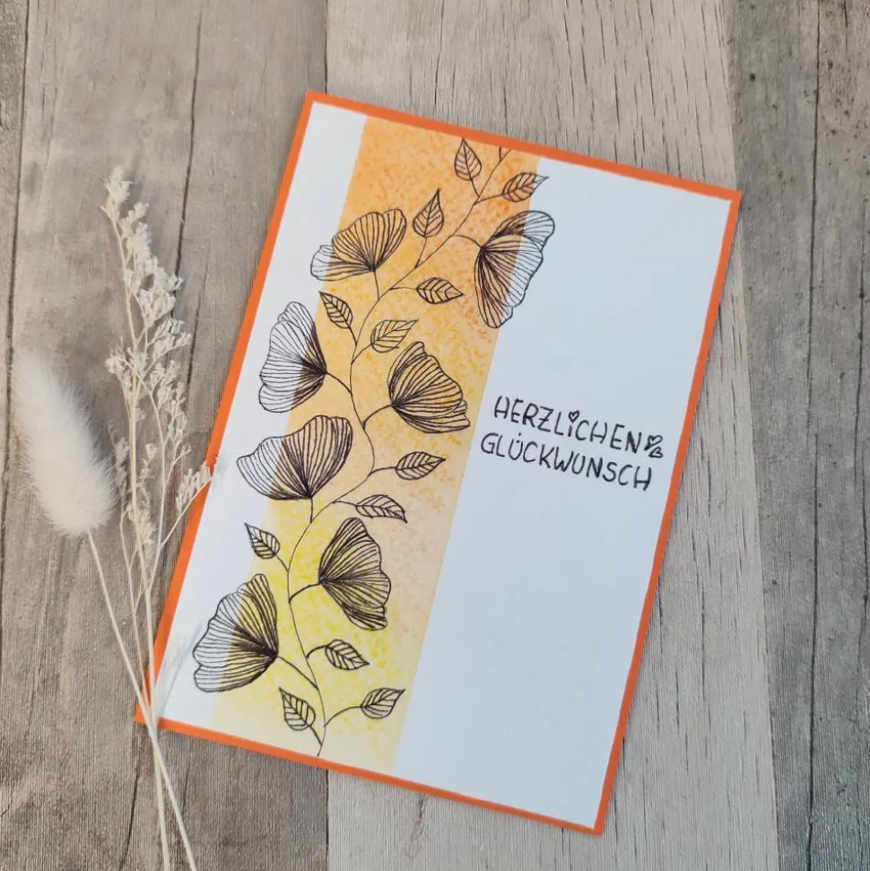 Die Grundkarte besteht aus Tonkarton. Auf einem Aquarellpapier habe ich Blüten und Blätter mit Fineliner auf von mir mit Aquarellfarbe gemalt Streifen gezeichnet. Der Schriftzug ist handgeschrieben. In der Karte liegt ein weißes Einlegeblatt.