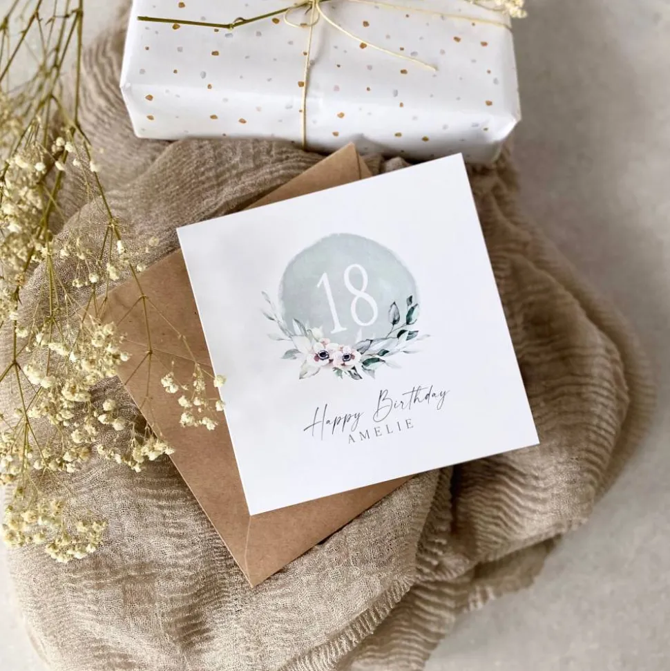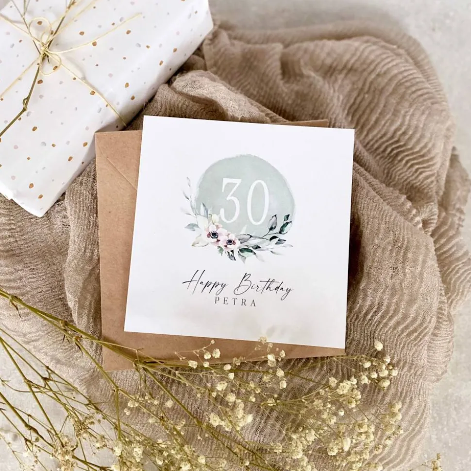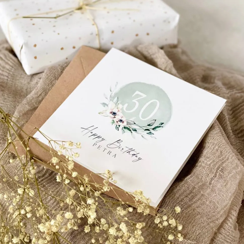 Personalisierte Klappkarte im Format 140x140mm erhaltet ihr mit einem passenden Kraftpapier-Briefumschlag.