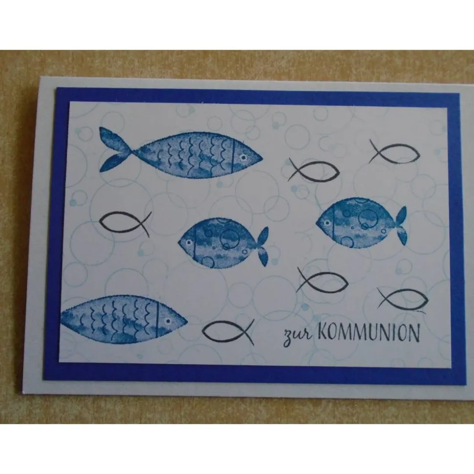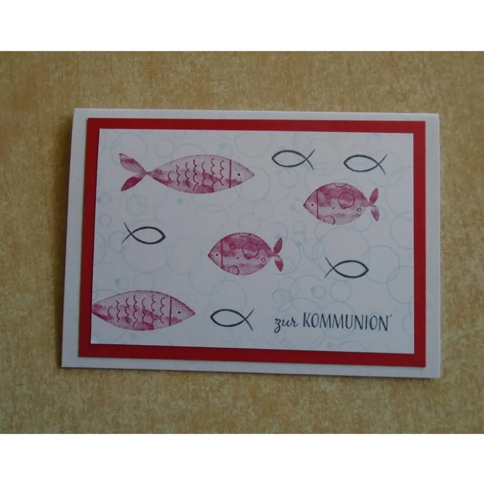 verziert wurden diese Kommunionkarten mit Fisch Stempel zur Kommunion