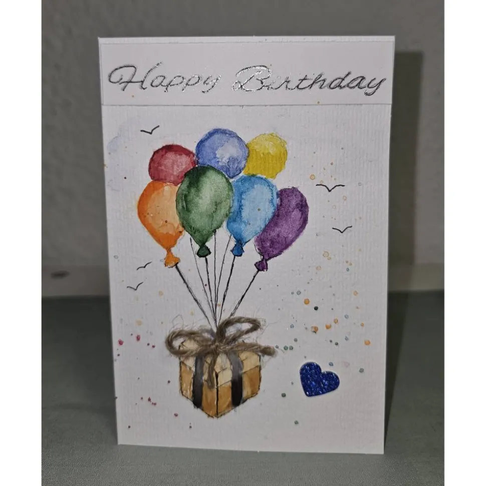 Bunte Luftballons fliegen zum Geburtstagskind. Der Himmel ist dezent in der Farbe blau angedeutet. Kleine Vögel begleiten das Präsent. Die Karte wurde verziert mit einer Schleife aus Sisal und einem blau glitzernden Herz. Ä