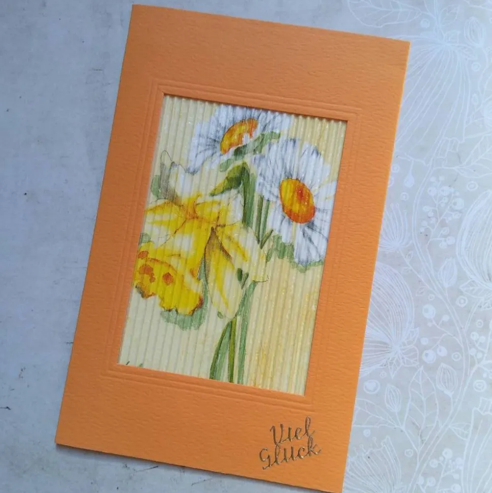 Die Passepartout-Karte habe ich mit Serviettentechnik dekoriert. Ein Schriftsticker vervollständigt die Karte. In ihr liegt ein weißes Einlegeblatt.