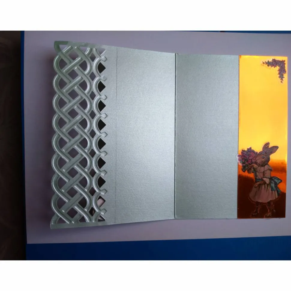 Diese mintgrünfarbene Karte hat auf der rechten Seite eine geprägte Ausstanzung diese ist zusätzlich mit einer goldenen Linie verziert.