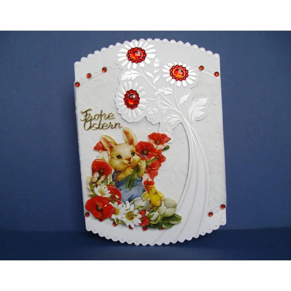 Auf der Vorderseite habe ich die Karte mit verschiedenen roten Schmucksteinen, Spruchsticker: Frohe Ostern und dem 3D Motiv Osterhase verziert.