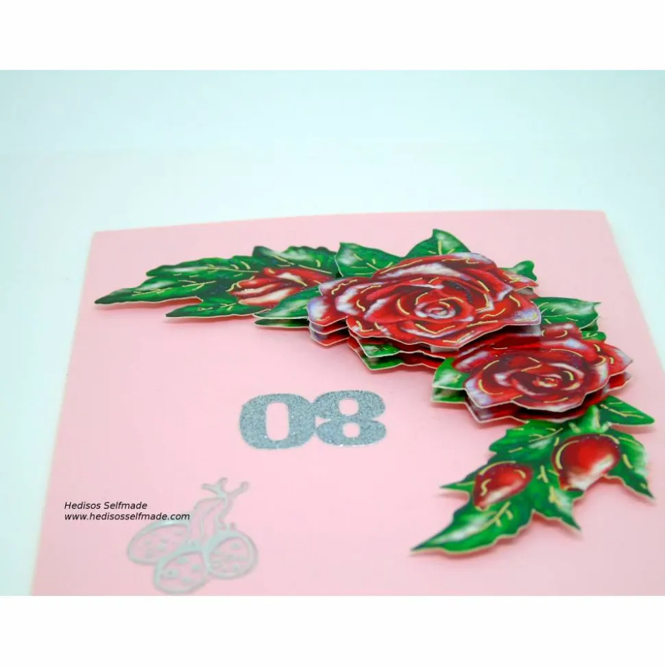 Das Motiv aus roten Rosen wurde von mir in 3-D-Optik gestaltet. Im Innenteil der Karte habe ich den silbernen Schriftzug „Zum Geburtstag alles Gute“ aufgebracht.