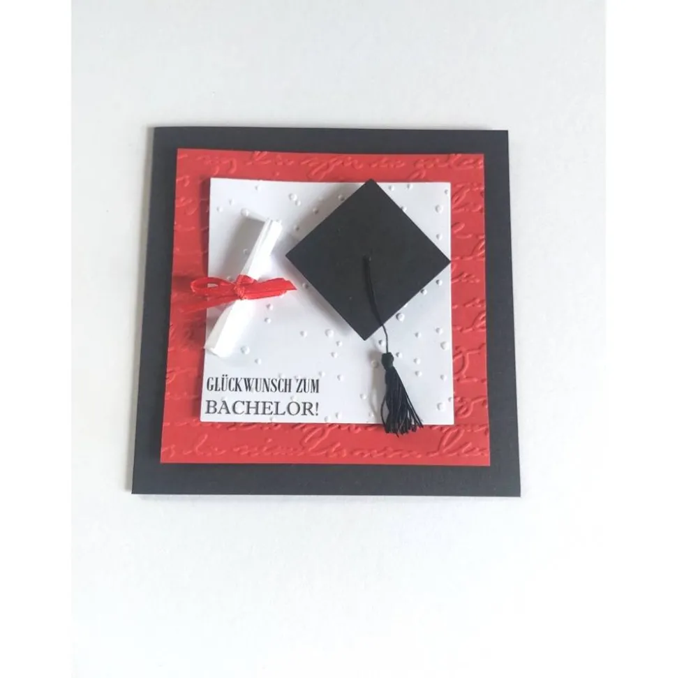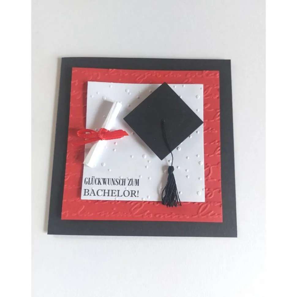 Quadratische Klappkarte in Handarbeit gefertigt für den Abschluss zum frischgekrönten Bachelor, mit geprägtem Hintergrund, Doktorhut, handgefertigter Quaste und Schriftrolle. Die Glückwunschkarte wird mit Einlegeblatt und Kuvert geliefert.