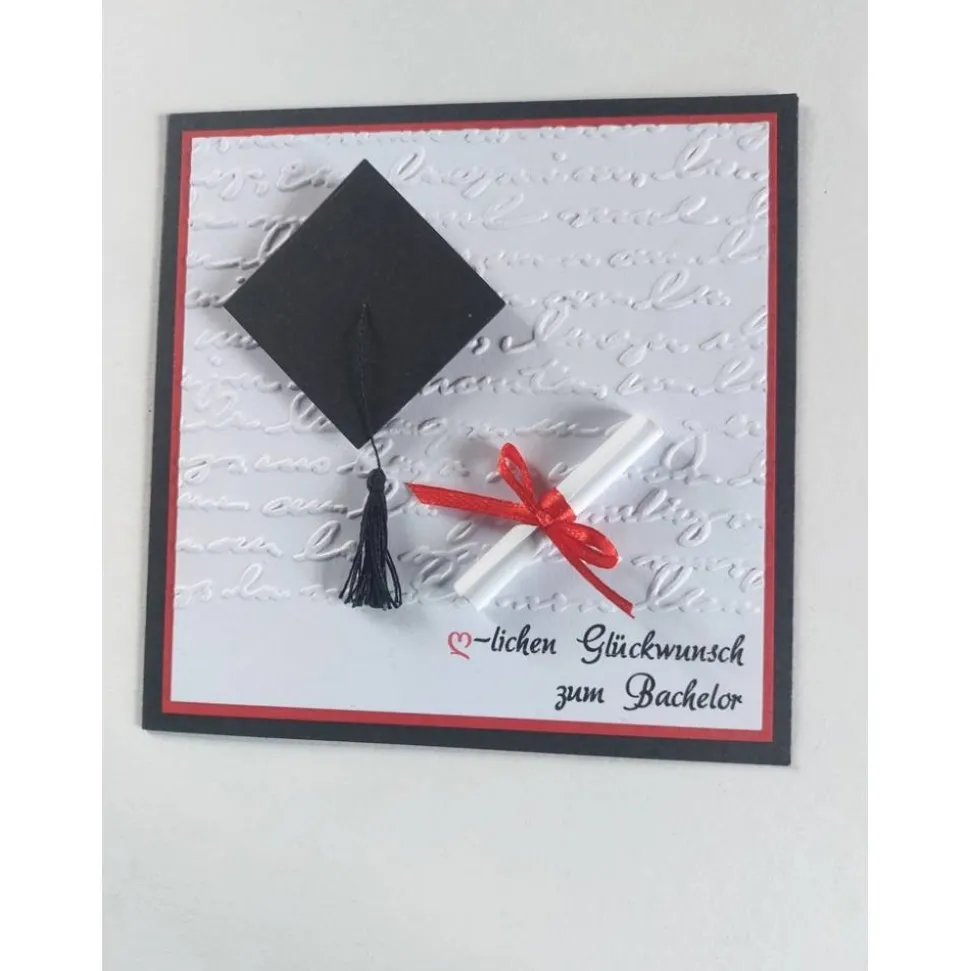 Glückwunschkarte zum Bachelor, handgemacht mit geprägtem Hintergrund, Doktorhut mit handgefertigter Quaste und Schriftrolle. Die Glückwunschkarte wird mit Einlegeblatt und Kuvert geliefert.