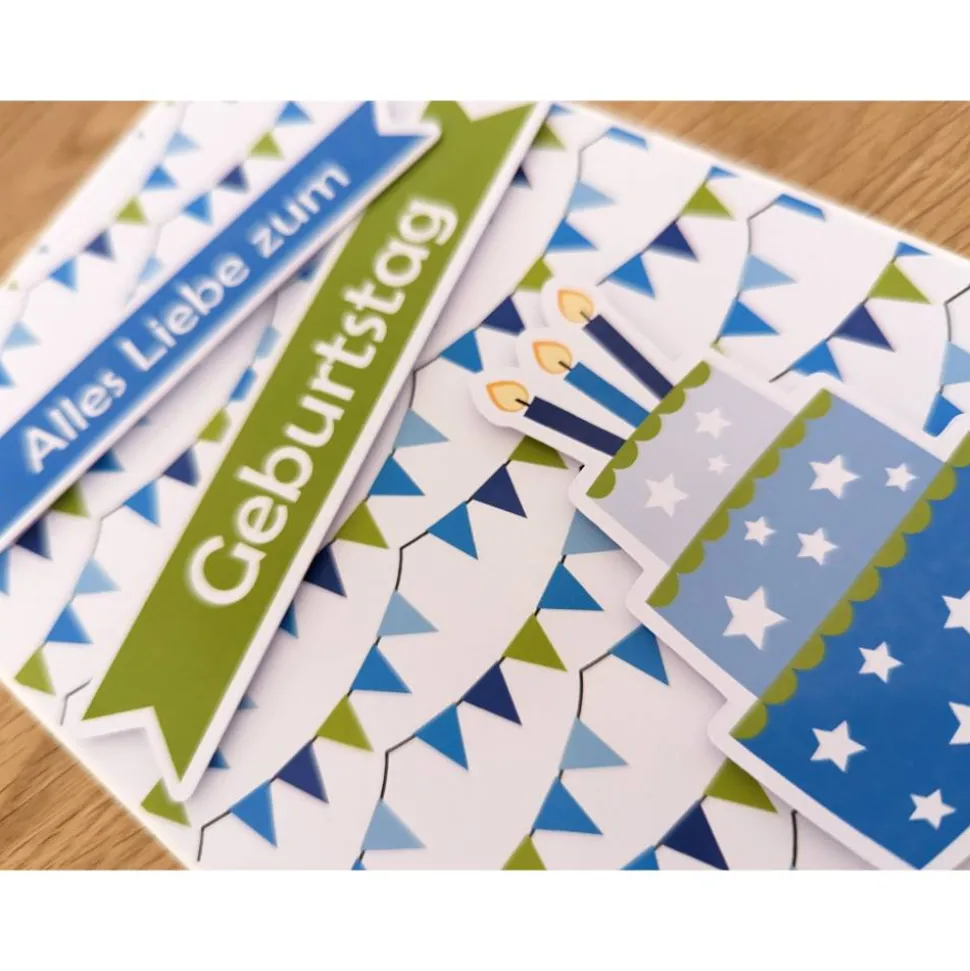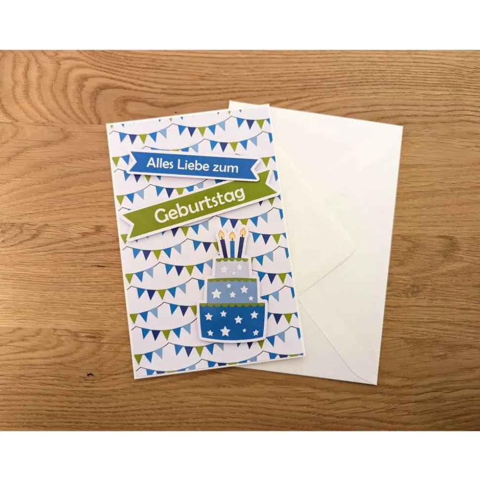 Klappkarte mit Geburtstags-Motiv in verschiedenen blau- und grüntönen.
