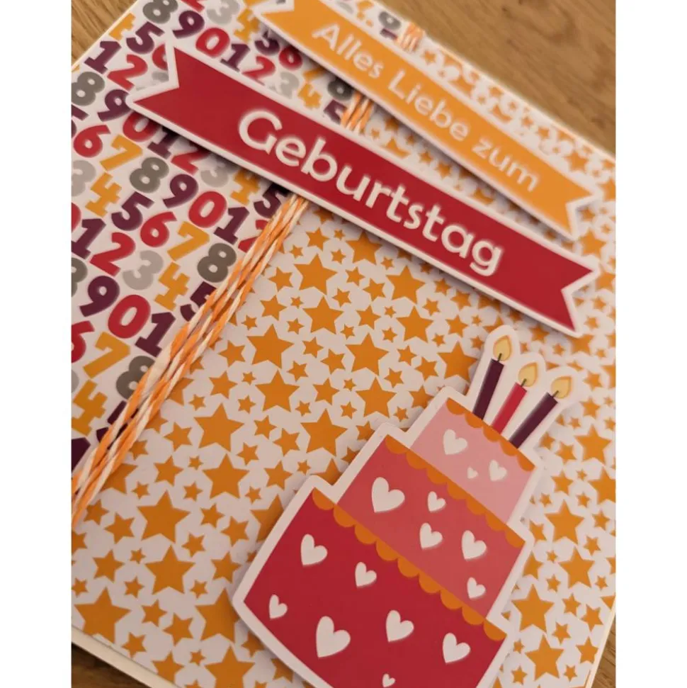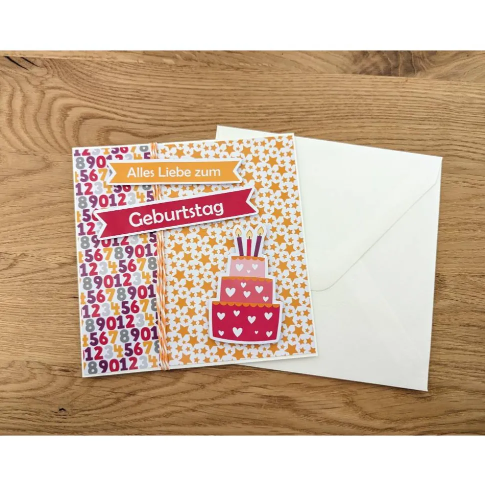 Klappkarte mit Geburtstags-Motiv in pink, gelb, orang und rosa usw.