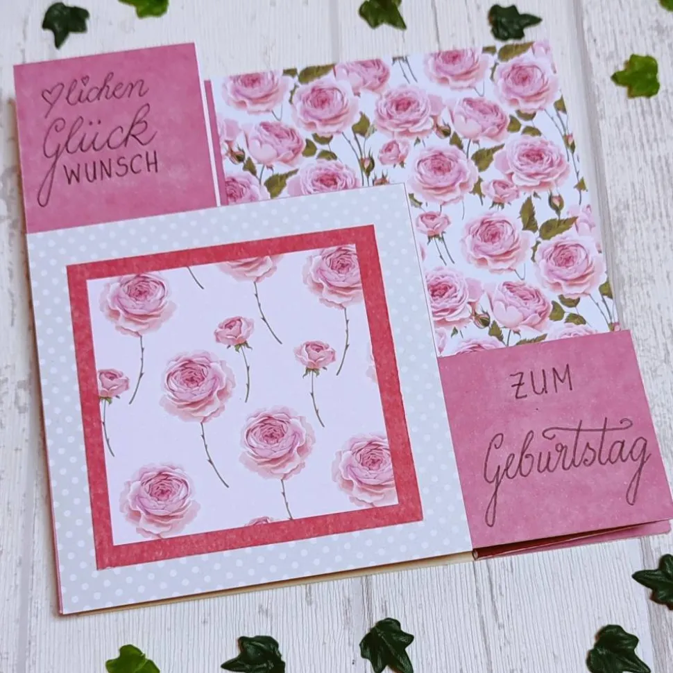 Hier hab ich eine Faltkarte gebastelt. Ich habe verschiedenen Tonkarton und Designpapier verwendet und mit ein paar Acrylperlen beklebt. Die Schrift ist handgeschrieben. Zusammengeklappt misst die Karte 15*15 cm, auseinandergefalten 25*15 cm.