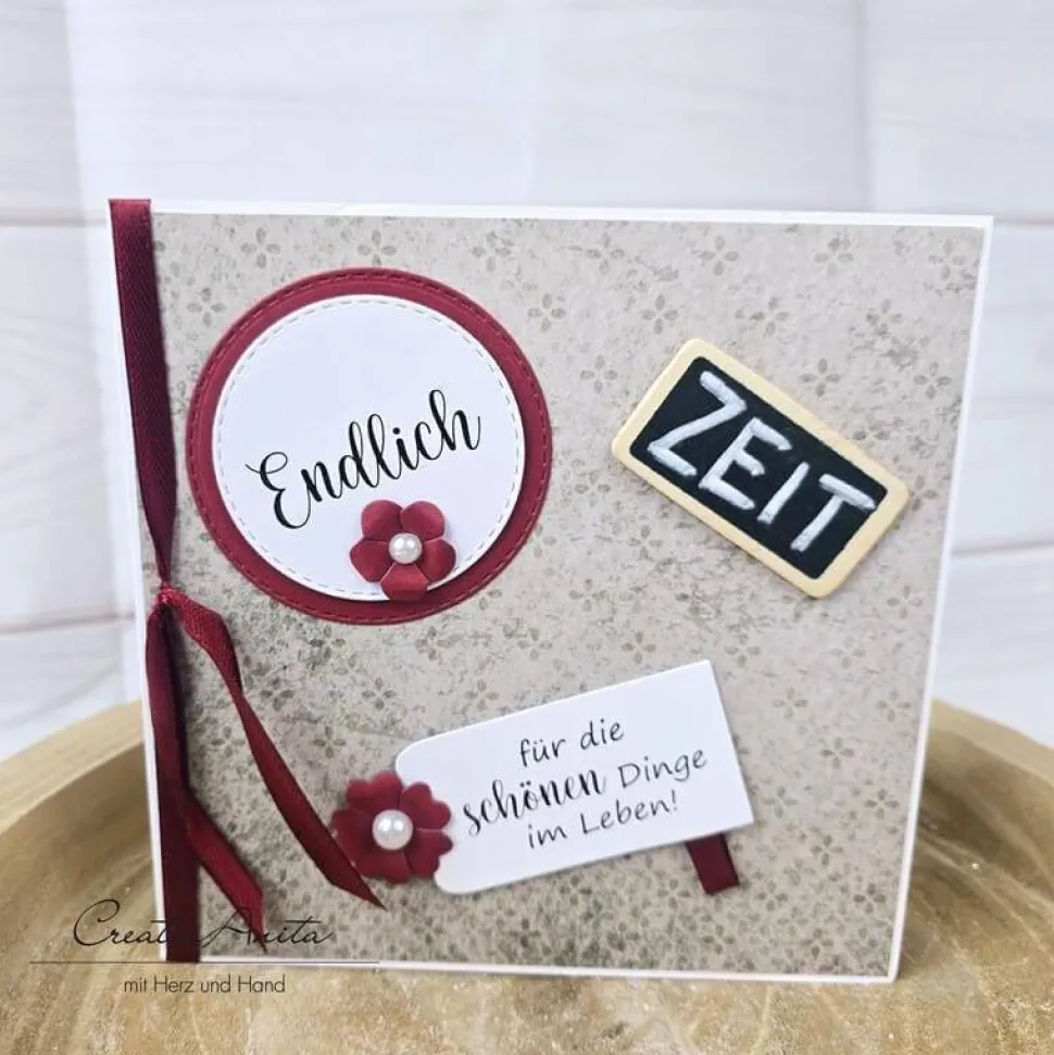 Material: Motiv- und Kartenkarton, Perlen, Schleifenband, Holztafel