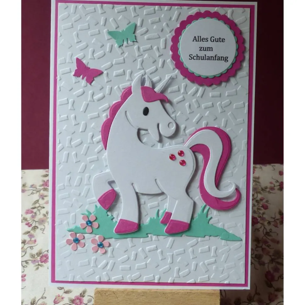 verziert ist die Karte mit einem Einhorn mit kleinen Blume und Schmetterlingr.