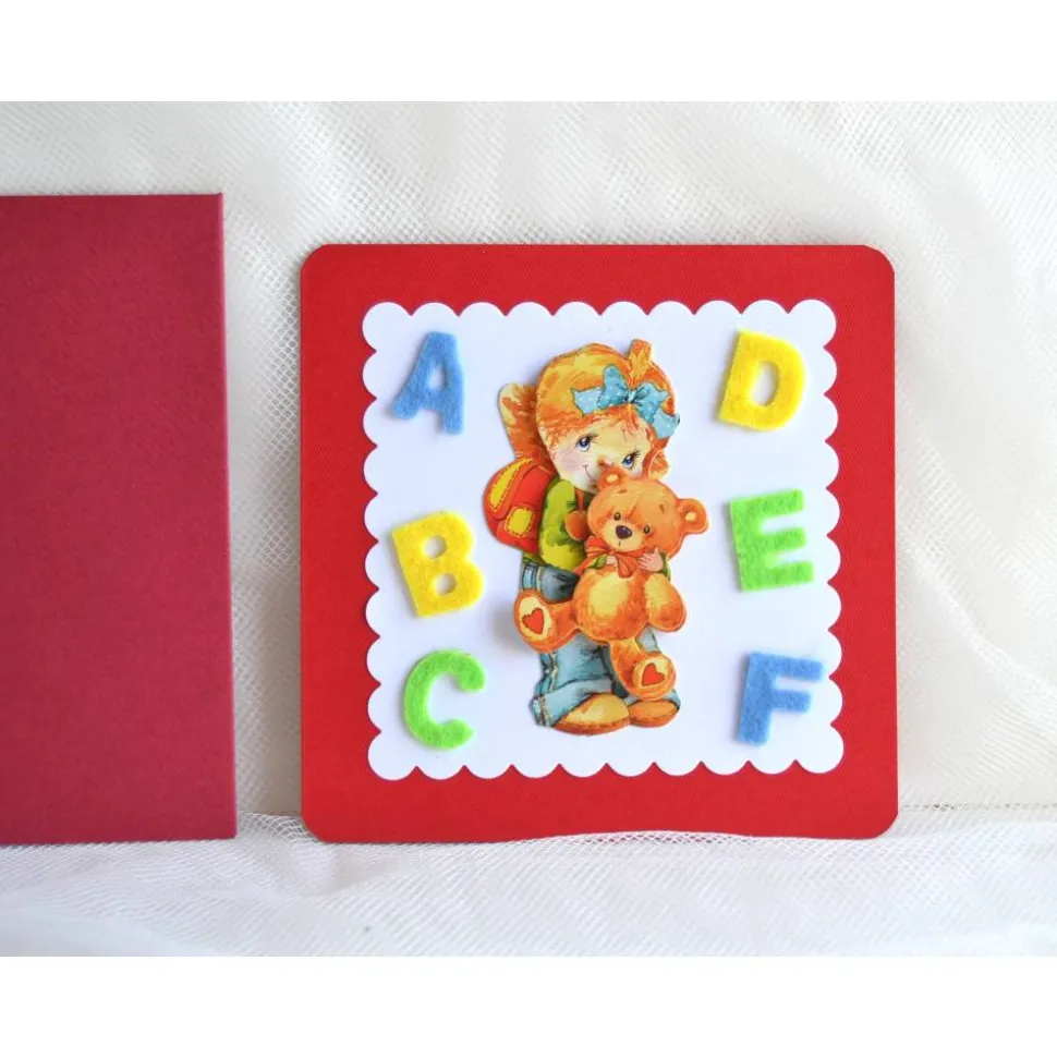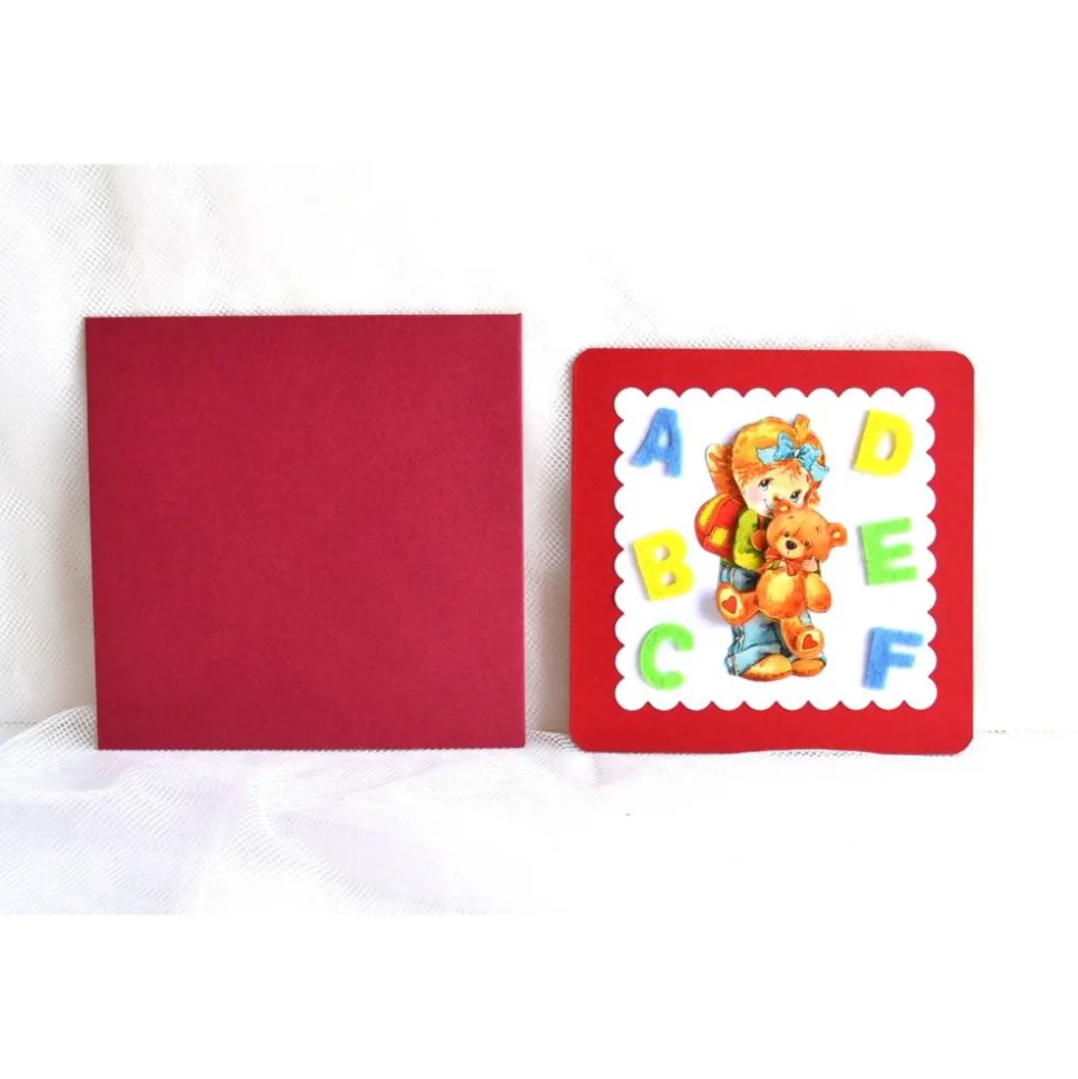 Glückwunschkarte zum Schulanfang Mädchen mit Bär rot-rot mit Filzbuchstaben A-F (4). Die Glückwunschkarte ist 13 x 13 cm und mit 3D Bildern verziert. In der Karte befindet sich ein Einlegepapier das beschriftet werden kann. Sie werden mit farblich passendem Kuvert geliefert.