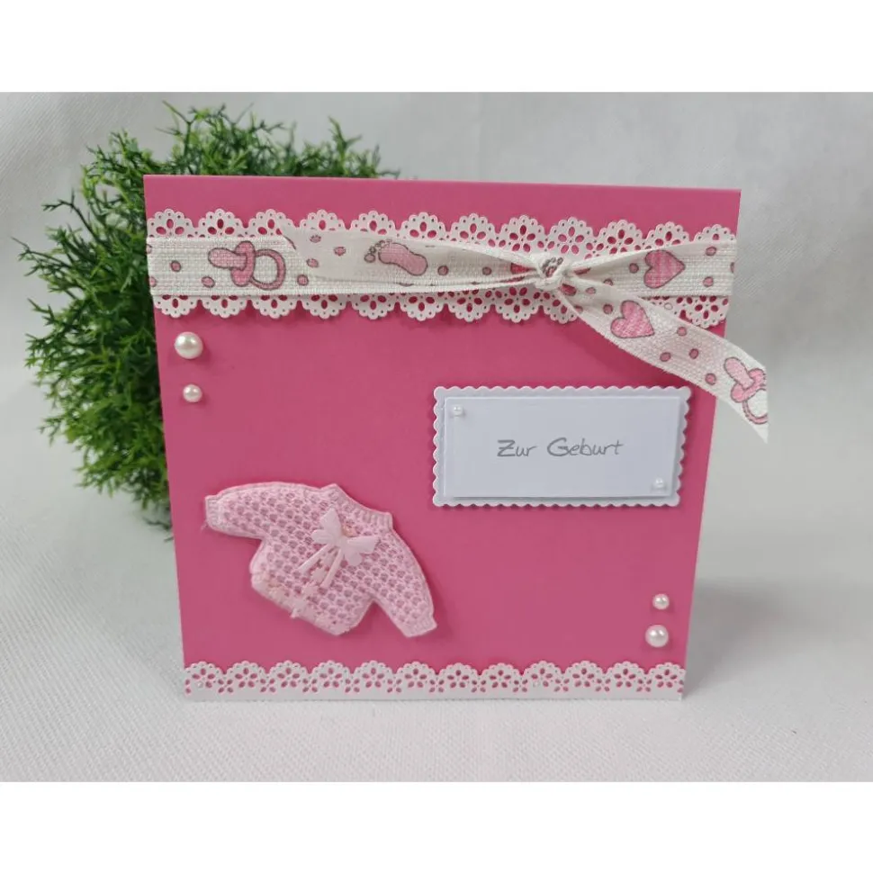 Material: Doppelkarte quadratisch, Spitzenbordüre, verschiedene Schleifenbänder, Halbperlen