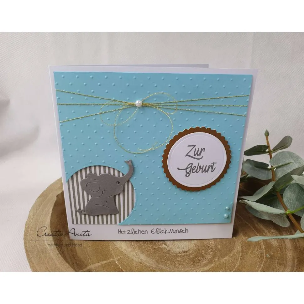 Material: Doppelkarte quadratisch, themenbezogene Stanzelemente, Spitzenband, Baumwollband,