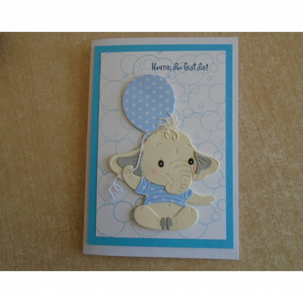Hier seht ihr eine schöne Glückwunschkarte zur Geburt für einen Jungen mit süssen Elefant..
