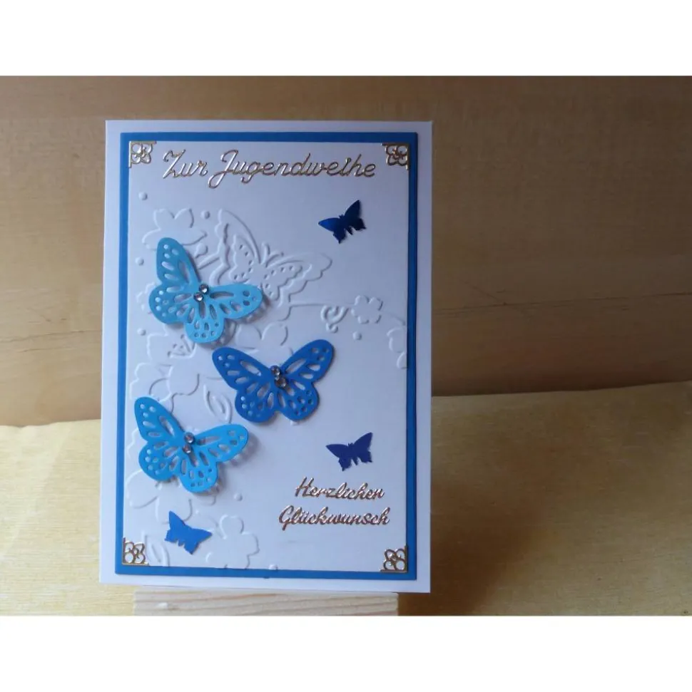 Die Grundekarte ist weiß mit blauen Tonpapier,geprägten weißen Papier unterlegt