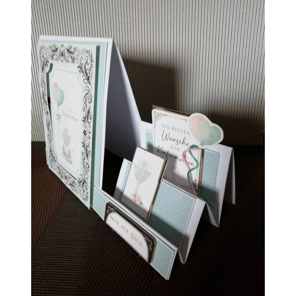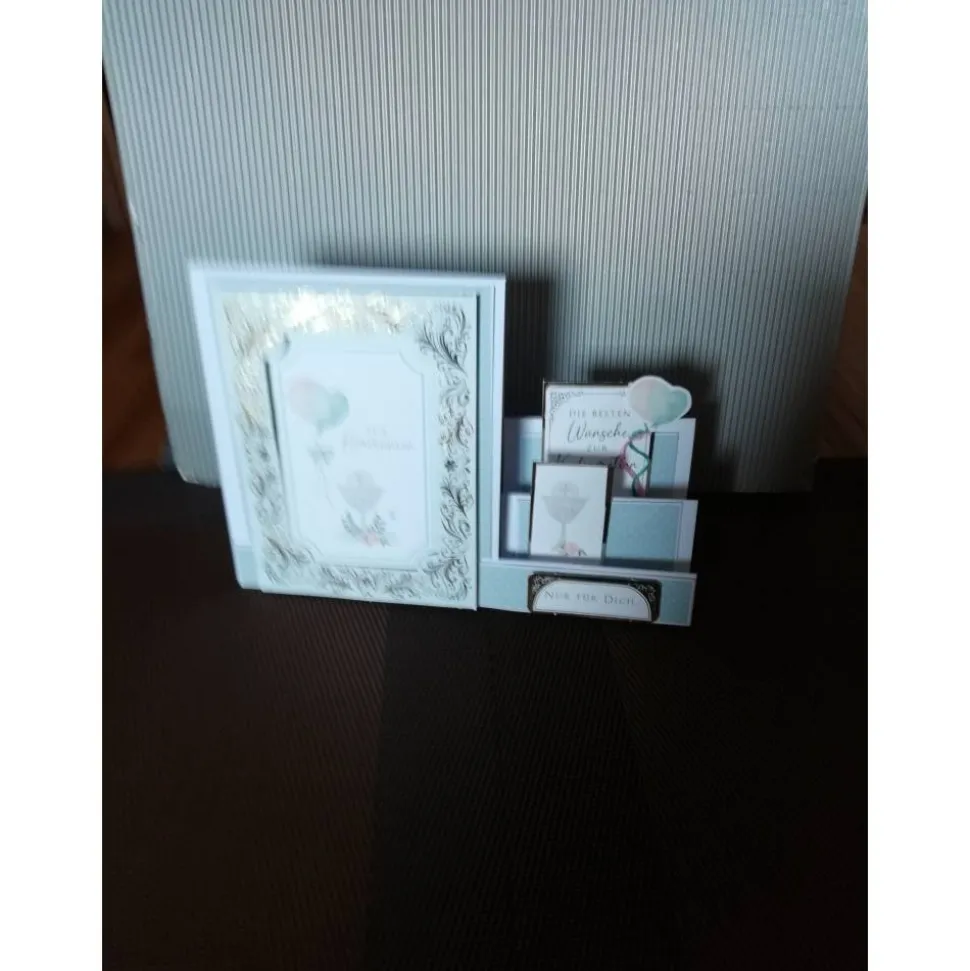Die Besten Wünsche zur Kommunion, Einem Kartenornament mit einem Kelch und ein Kartenornament mit dem Spruch: Nur für Dich angebracht.