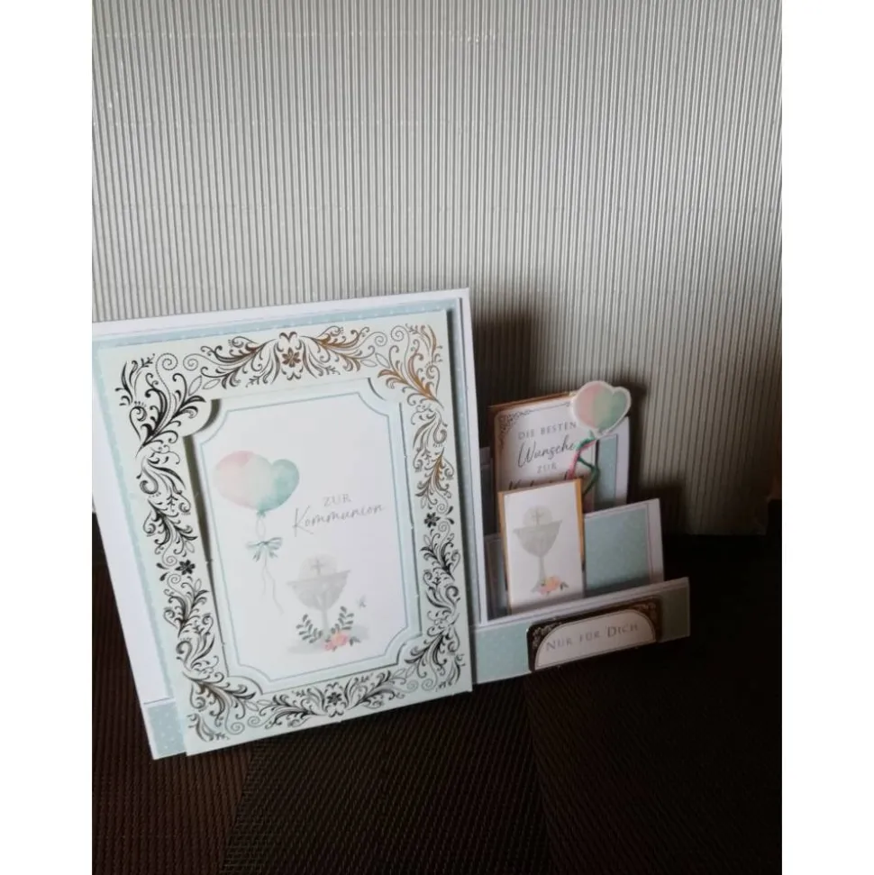 Auf der großen Fläche ein Kartenrahmen mit goldener Umrandung, durch diese Umrandung sieht man ein Kartenornament, welcher mit Ballons, einem Kelch und der Schrift: Zur Kommunion bedruckt ist.