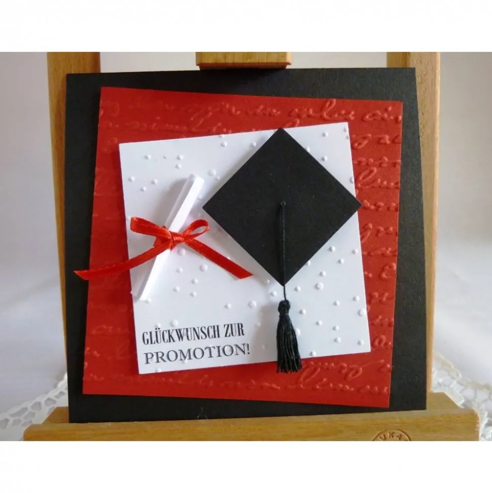 Quadratische Klappkarte in Handarbeit gefertigt zur Promotion, mit geprägtem Hintergrund, Doktorhut, handgefertigter Quaste und Schriftrolle. Die Glückwunschkarte wird mit Einlegeblatt und Kuvert geliefert.