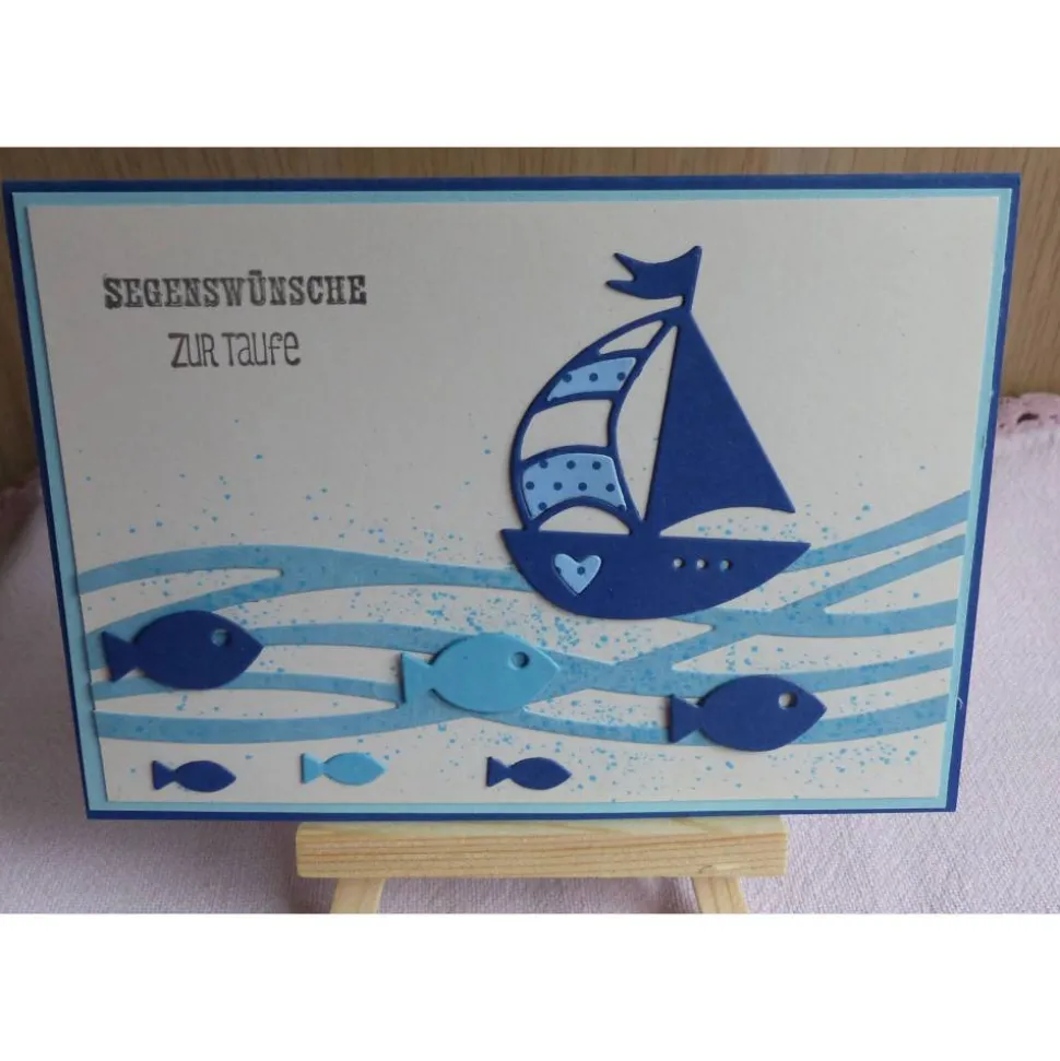 Die harmonische Farbkombination in Blautönen verziert mit einem Boot und Fischen und Wellen sind ganz bezaubernd.