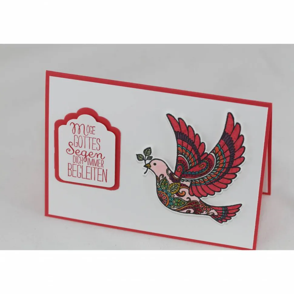 Die Grundkarte ist in einem rötlichen Pink. Darauf klebt ein weißer Aufleger. Diesen zieren ein kleines Schildchen mit dem Glückwunsch, der ebenfalls in diesem rötlichen Pink gemattet wurde. Der Hingucker ist allerdings die Taube, die von mir in verschiedenen Farben wie pink, lila, türkis, rot, rosa, grün und gelb coloriert wurde, ausgeschnitten und mit Abstandklebepads aufgebracht wurde.