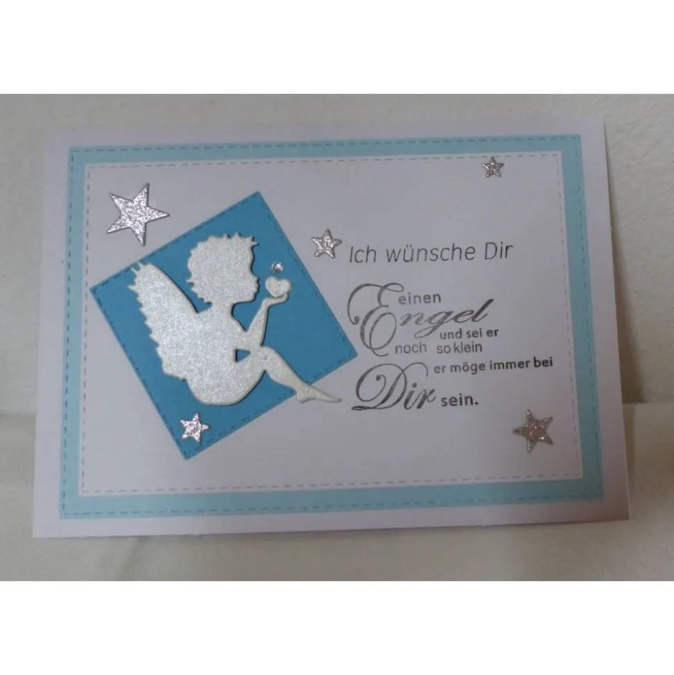 Die harmonische Farbkombination in Blautönen oder Rosatönen verziert mit einem Engel und Sternen auf weißen Untergrund sind ganz bezaubernd.