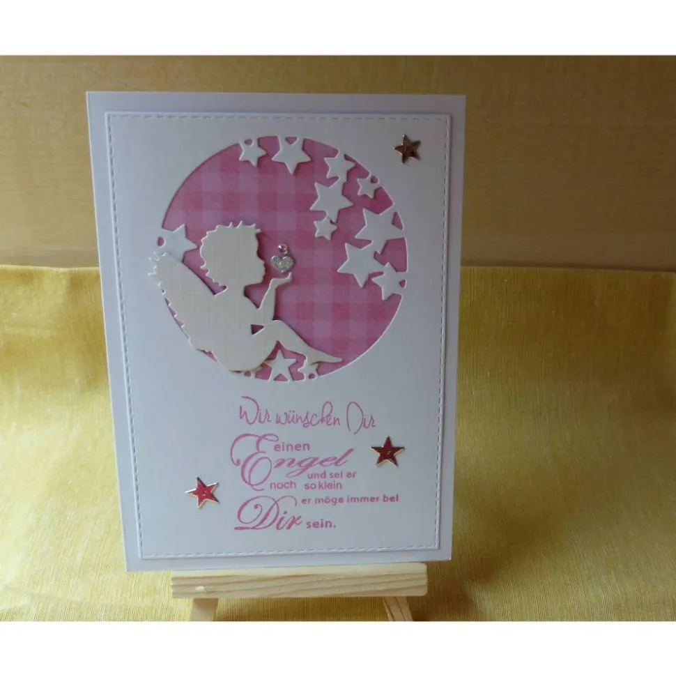 Die harmonische Farbkombination in Blautönen oder Rosatönen verziert mit einem Engel und Sternen auf weißen Untergrund sind ganz bezaubernd.