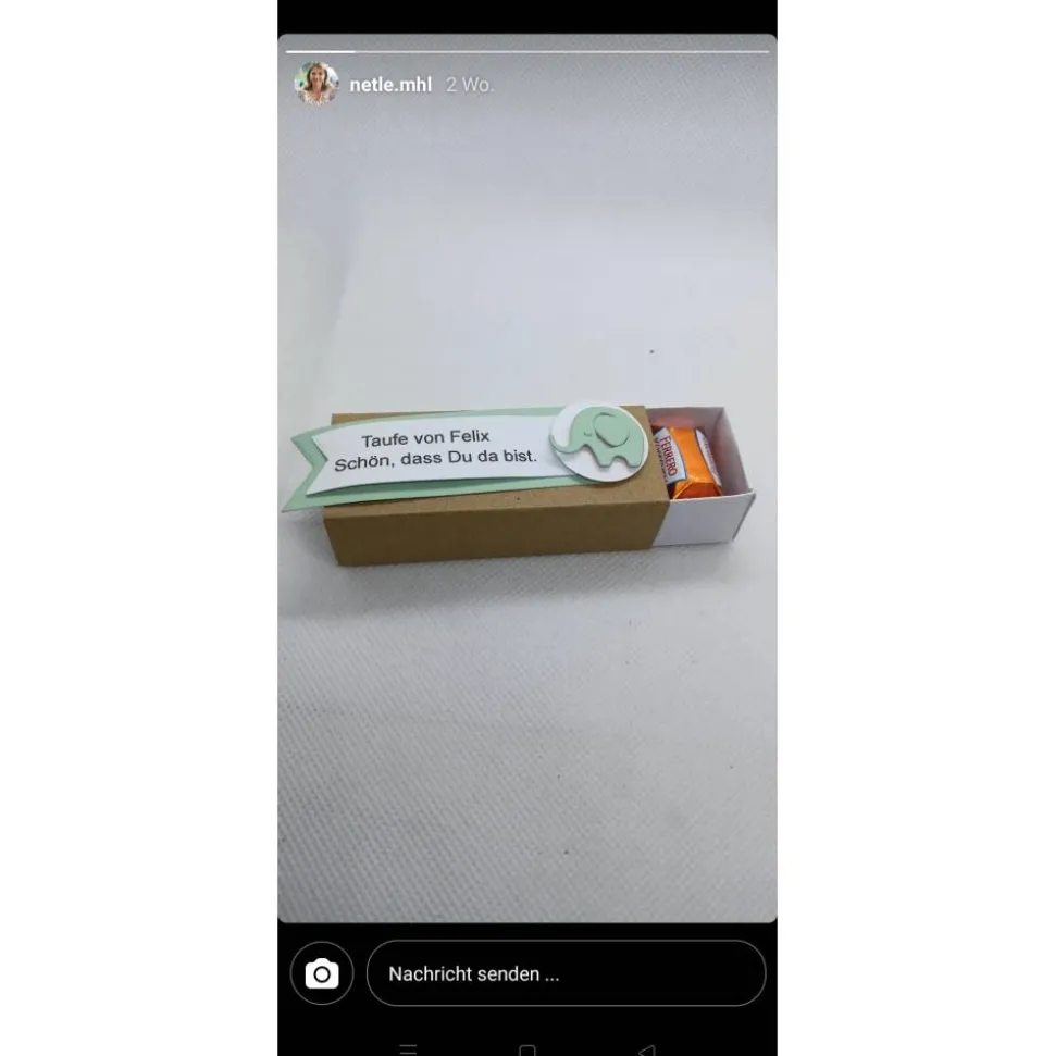 Die Farbe des Designpapier kann frei ausgewählt werden, ebenso die Form und der Text des kleinen Motives auf den Goodie.