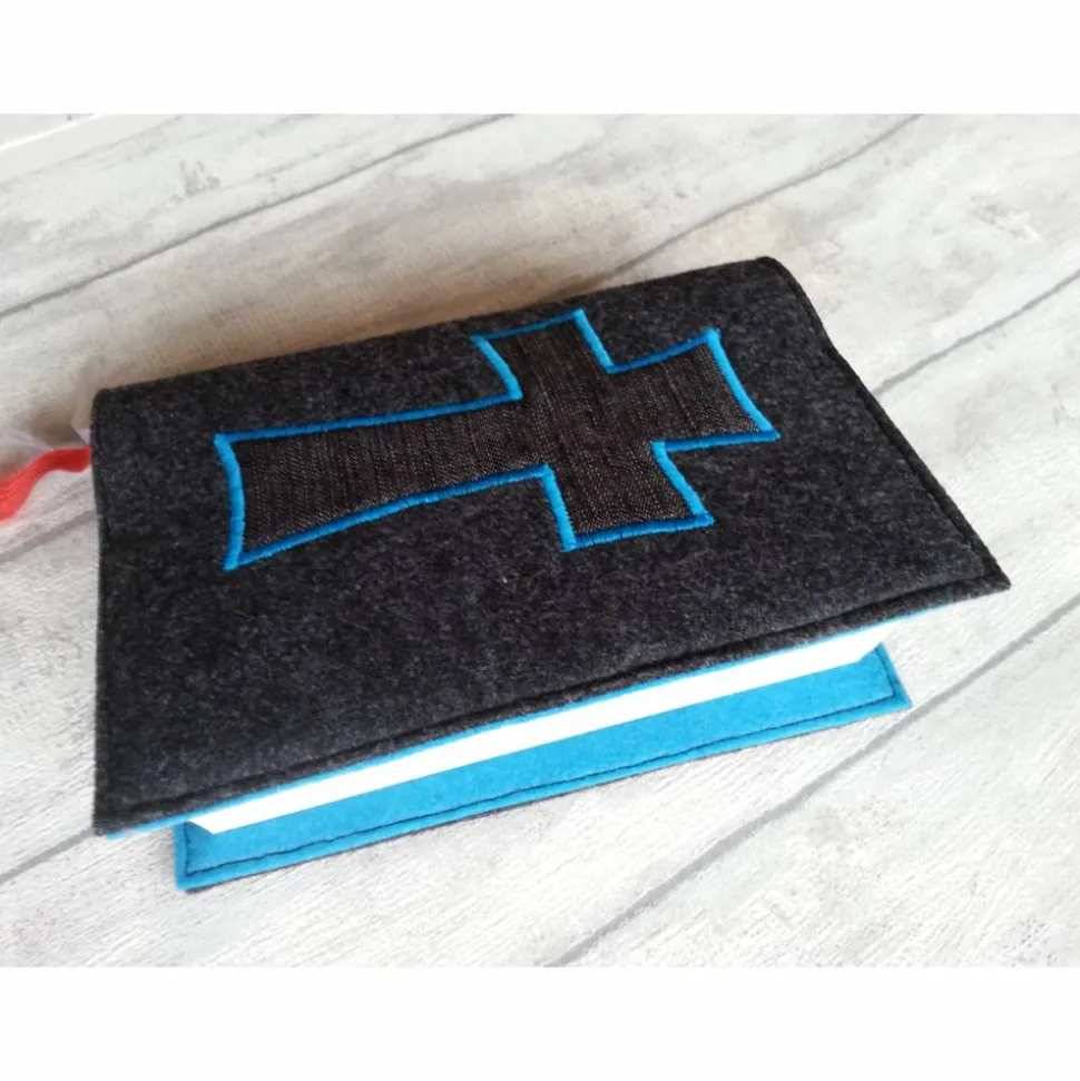 Der Einband ist aus Filz. In dunkelgrau-meliert, vorne ist ein Kreuz in türkis umrandet. Die Innenstreifen sind in türkis.